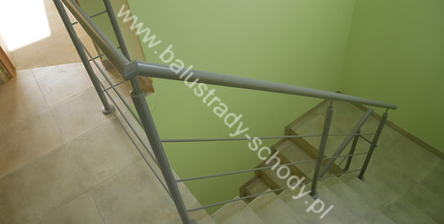 Balustrady ze stali klasycznej lakierowanej na kolor RAL 7036 MAT. Przekroje słupków i poręczy klasyczne, okrągłe przez co też delikatne. Montaż w sposób tradycyjny do posadzki poprzez lasze i ozdobne rozetki. Poszczególne biegi zostały usztywnione poprzez dyskretny łącznik pomiędzy słupkami. Dodatkowo podobne usztywnienie wykonaliśmy na piętrze kotwiąc je do ściany. Srebrny kolor w tym wypadku idealnie zgrał się z wnętrzem klatki w odcieniach zieleni.