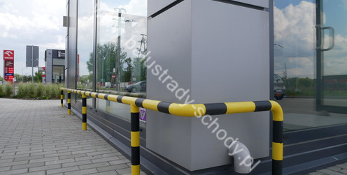 Relingi wykonane ze stali klasycznej ocynkowanej ogniowo i lakierowanej na intensywny żółty kolor w czarne pasy w celu ochrony budynku przed uderzeniami pojazdów. Montaż został wykonany na specjalnych stopach ukrytych w kostce. Wysokość relingów została dostosowana do średniej wysokości zderzaków samochodowych. Łuki w narożnikach konstrukcji dodają jej lekkości i powodują, że reling jest tylko delikatnym podkreśleniem budynku i nie przytłacza go wizualnie.