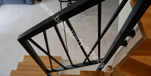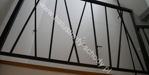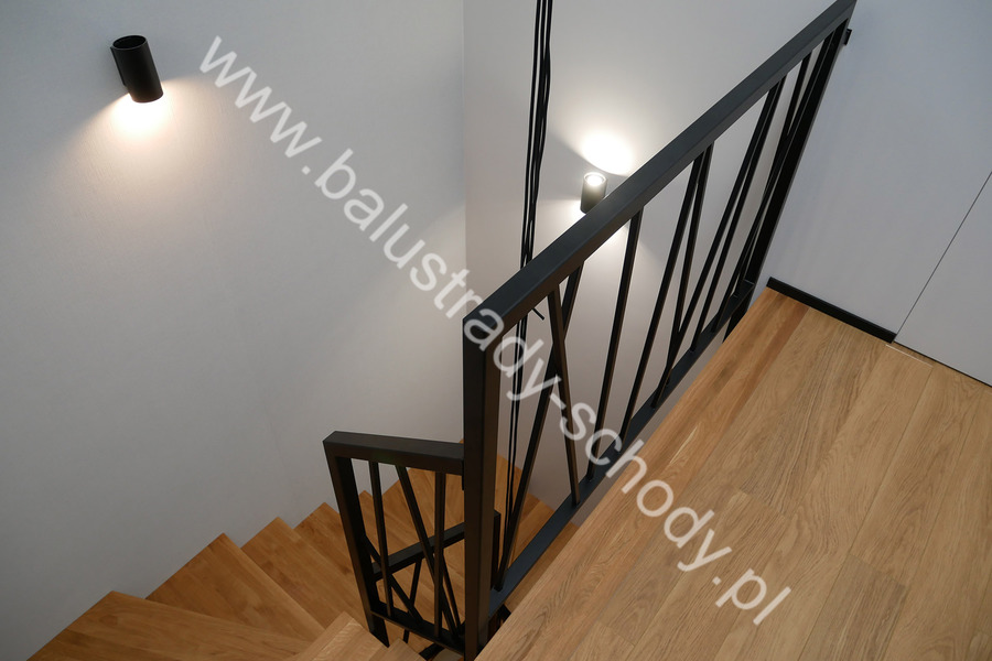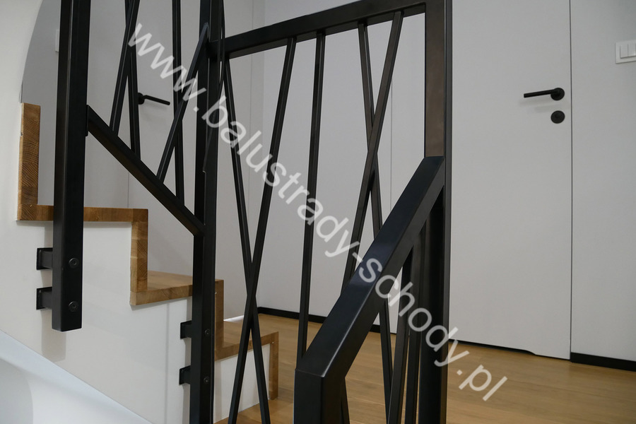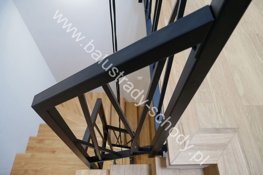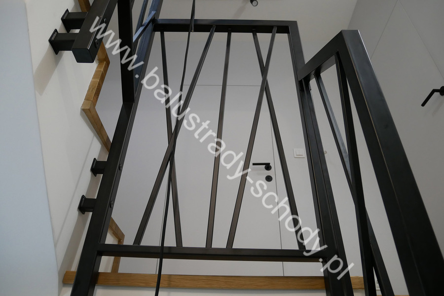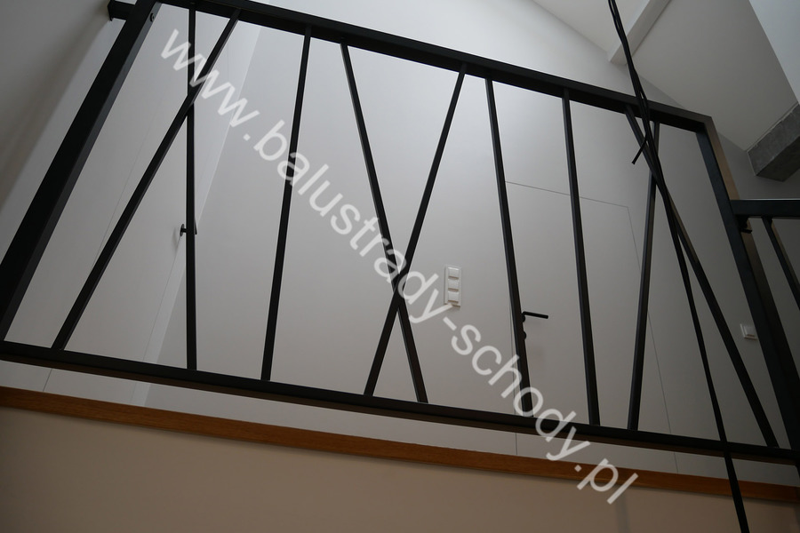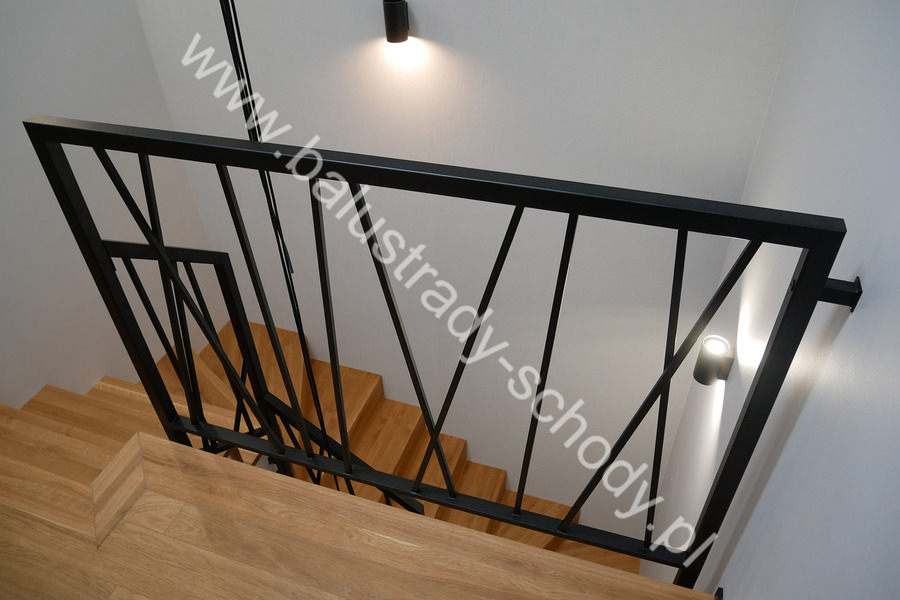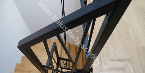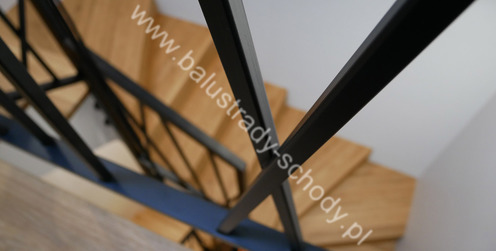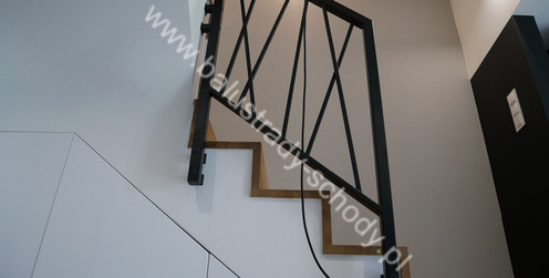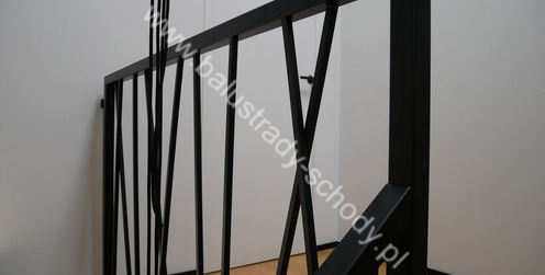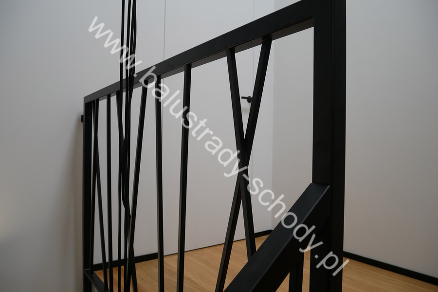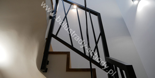 Balustrady wewnętrzne mocowane do policzka schodów wewnętrznych, nieregularnych w sposób kaskadowy. Wzór artystyczny w formie pionowych wypełnień wykonanych z profili ułożonych w 2 osiach. Takie rozłożenie tralek daje nam niesamowity efekt wizualny w formie 3d. Kolor balustrad to matowa czerń w klasycznym już RAL 9005. Śruby w czarnej oksydzie, słupki kwadratowe i wszystko inne dopięte na ostatni guzik.
