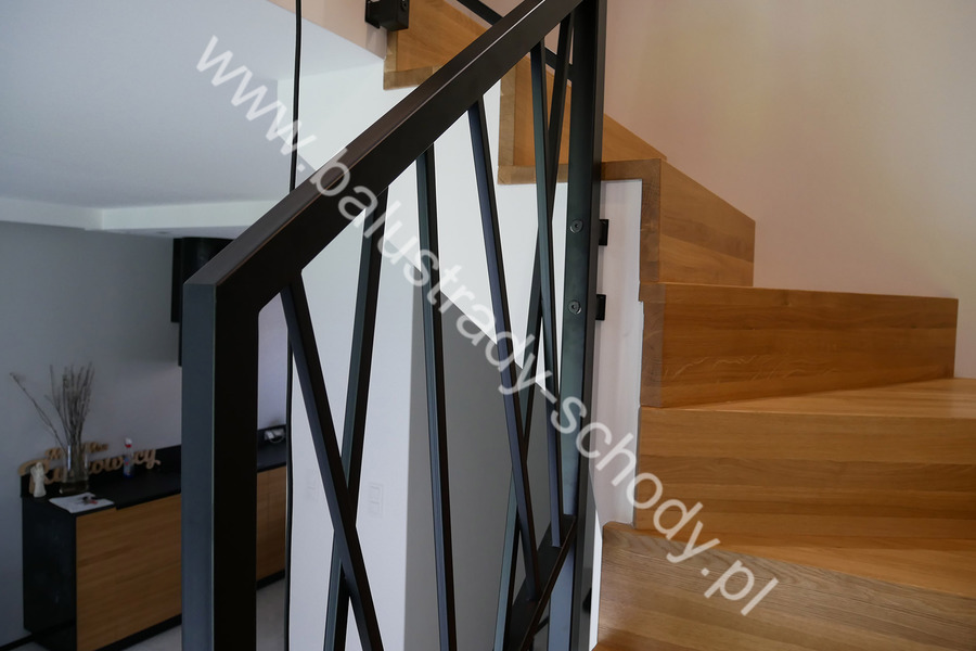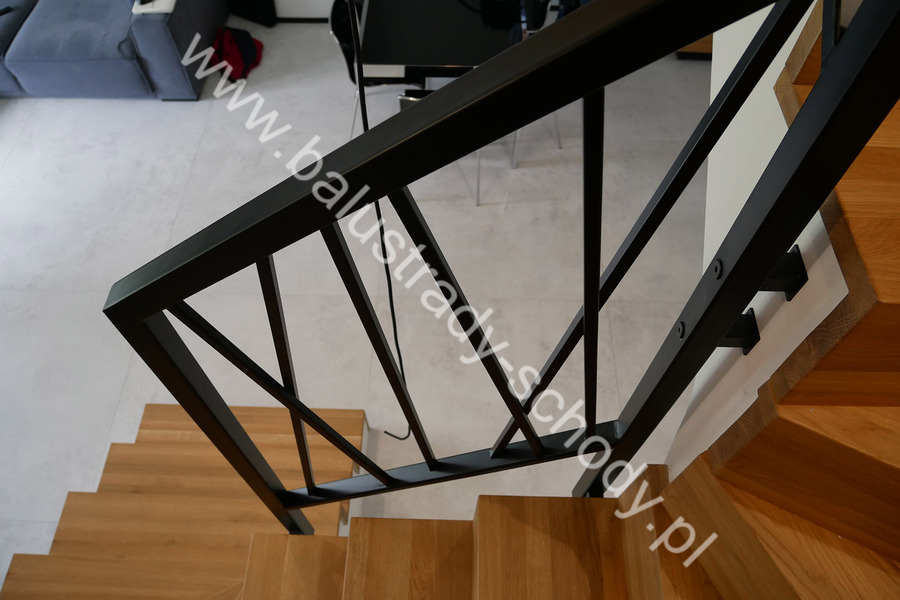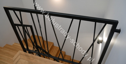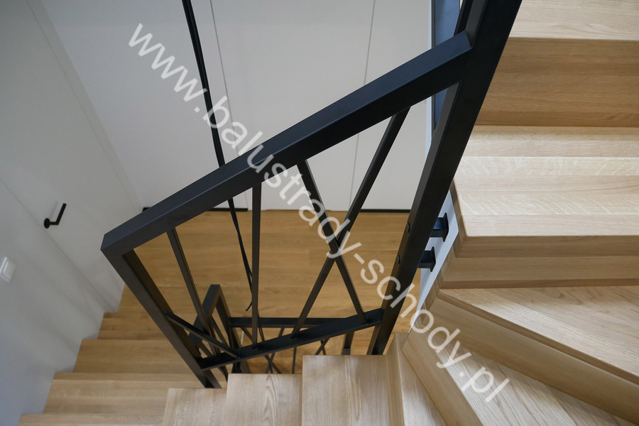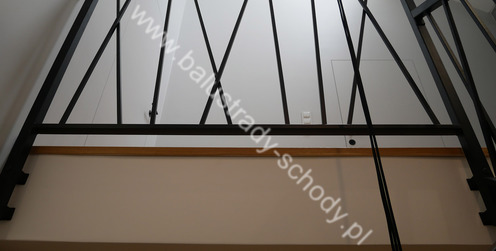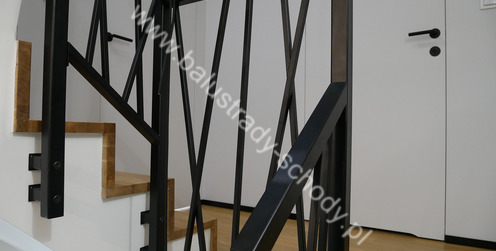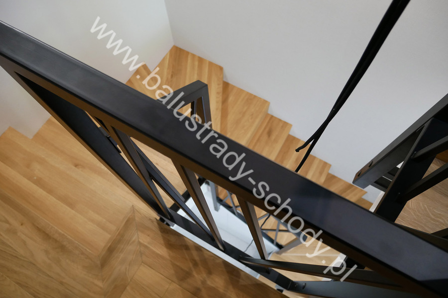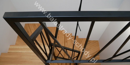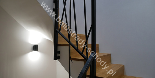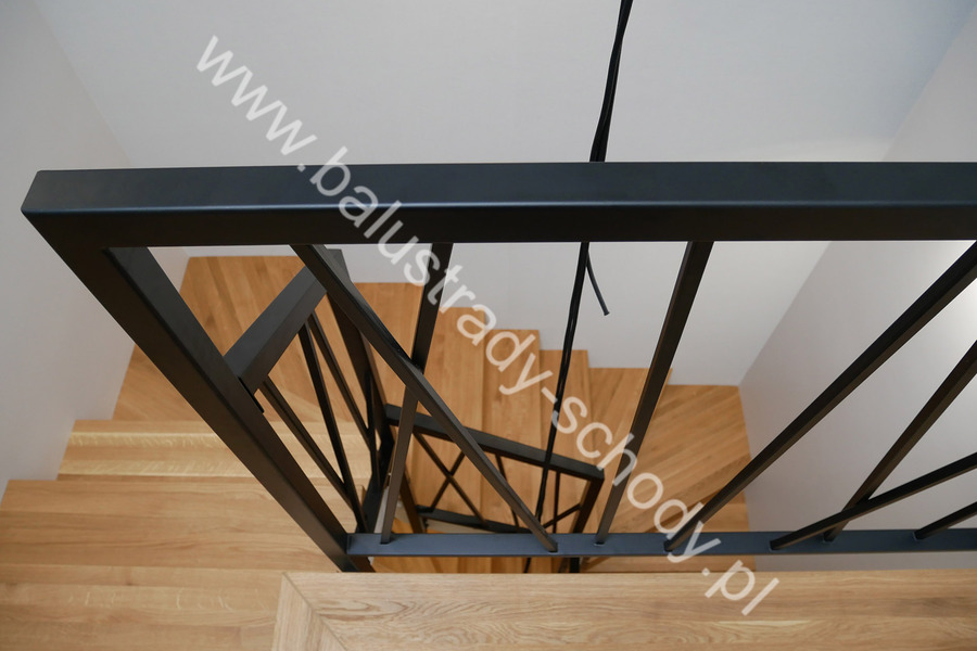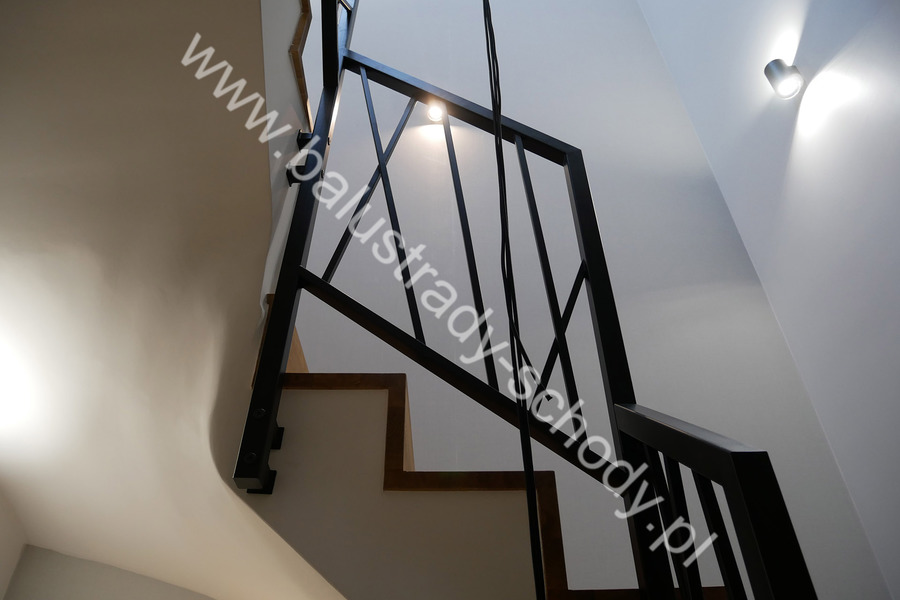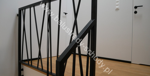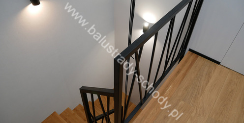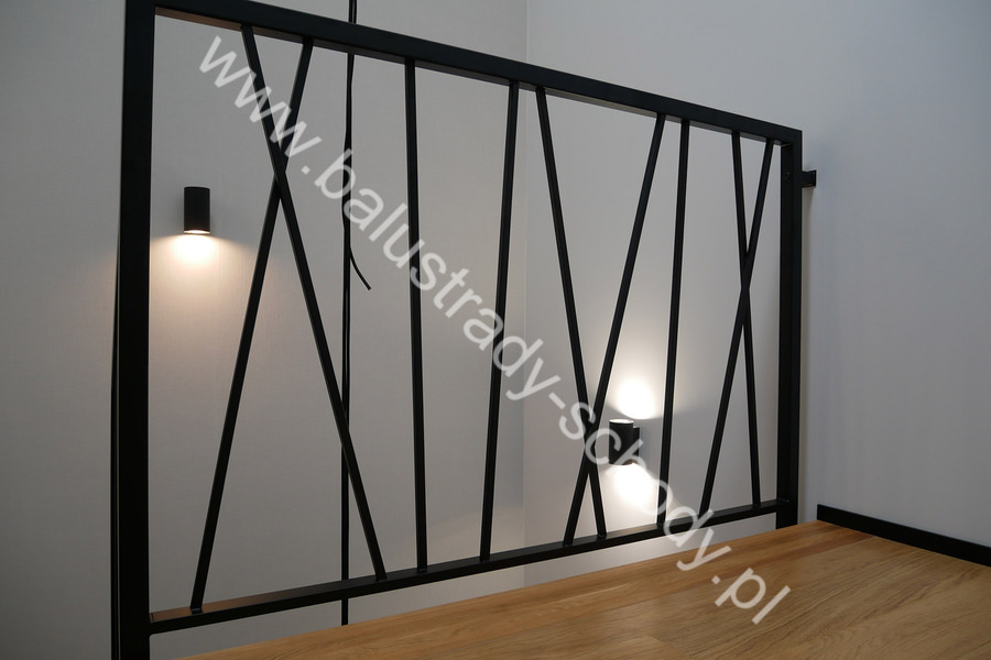 Balustrady wewnętrzne mocowane do policzka schodów wewnętrznych, nieregularnych w sposób kaskadowy. Wzór artystyczny w formie pionowych wypełnień wykonanych z profili ułożonych w 2 osiach. Takie rozłożenie tralek daje nam niesamowity efekt wizualny w formie 3d. Kolor balustrad to matowa czerń w klasycznym już RAL 9005. Śruby w czarnej oksydzie, słupki kwadratowe i wszystko inne dopięte na ostatni guzik.