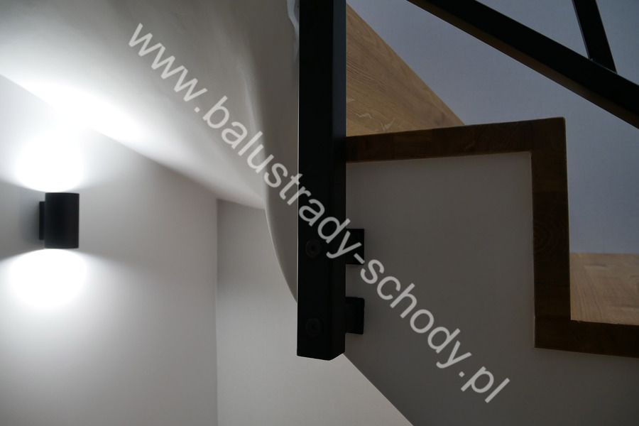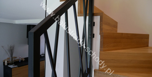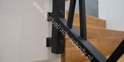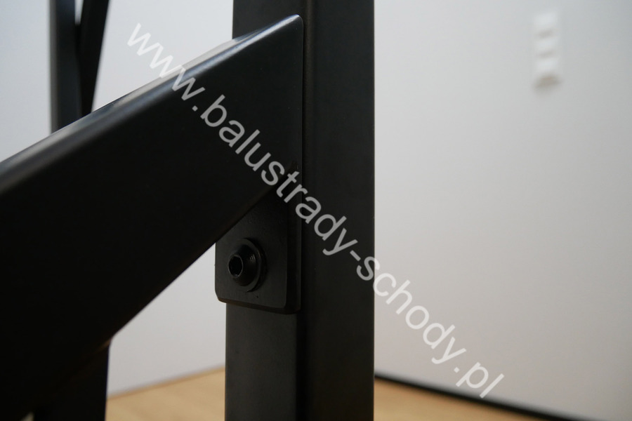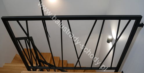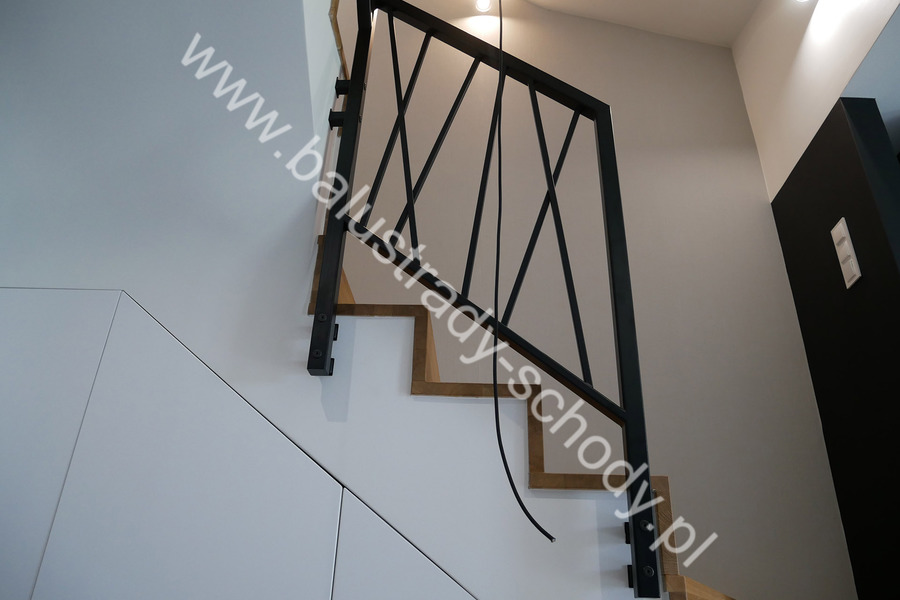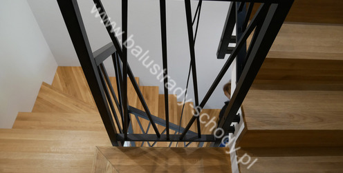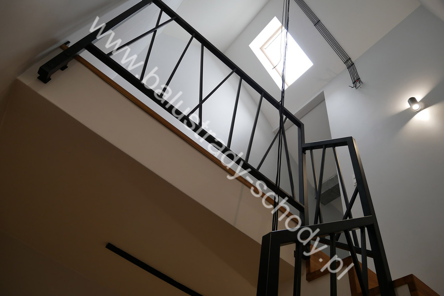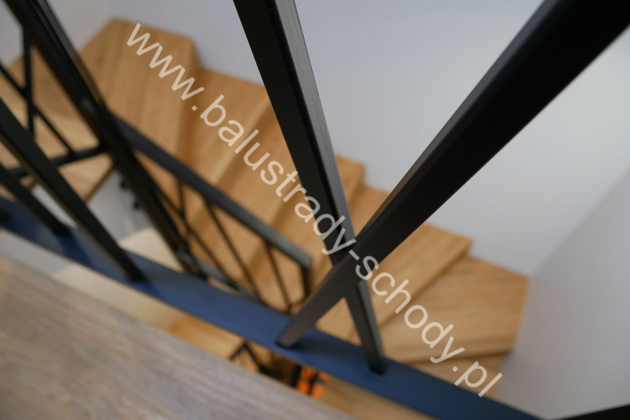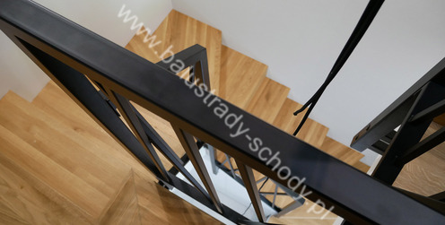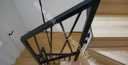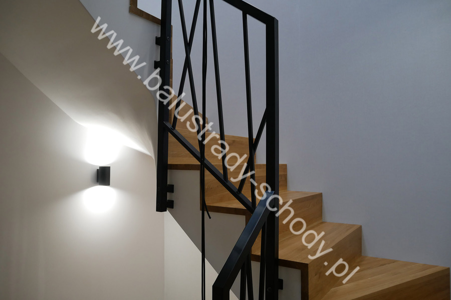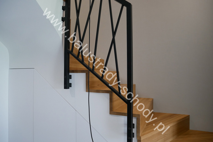 Balustrady wewnętrzne mocowane do policzka schodów wewnętrznych, nieregularnych w sposób kaskadowy. Wzór artystyczny w formie pionowych wypełnień wykonanych z profili ułożonych w 2 osiach. Takie rozłożenie tralek daje nam niesamowity efekt wizualny w formie 3d. Kolor balustrad to matowa czerń w klasycznym już RAL 9005. Śruby w czarnej oksydzie, słupki kwadratowe i wszystko inne dopięte na ostatni guzik.