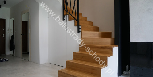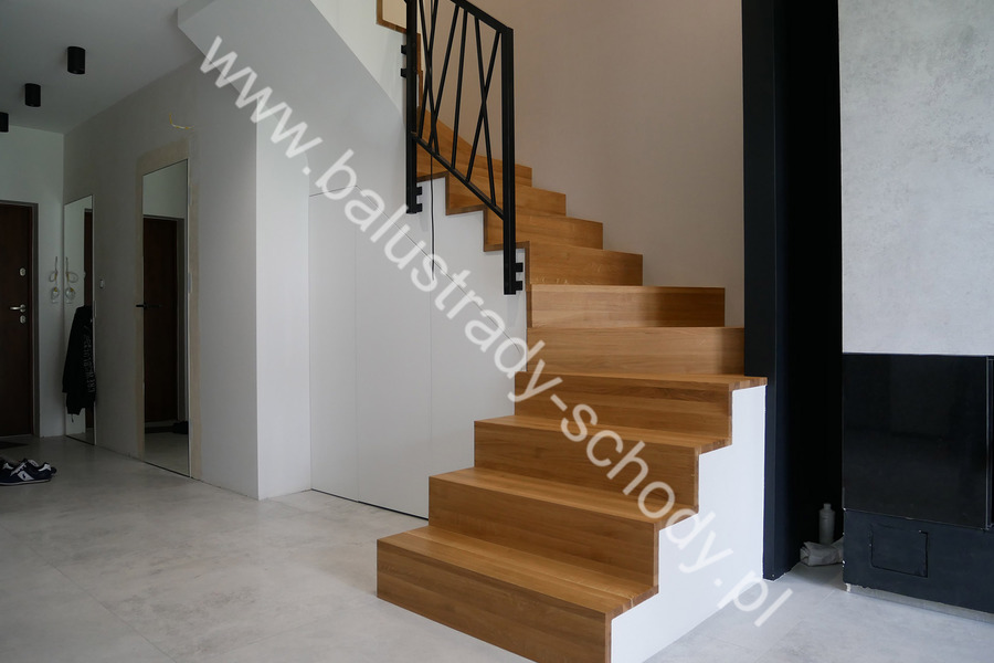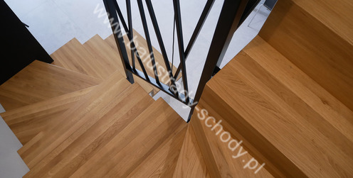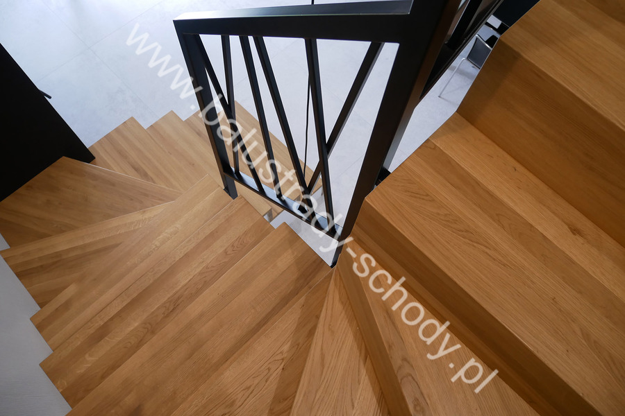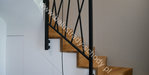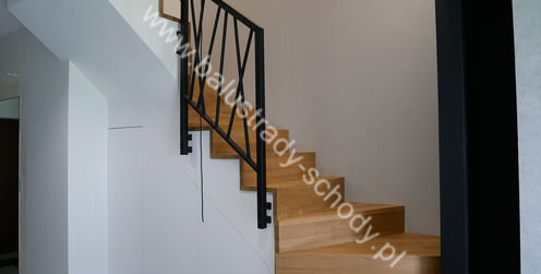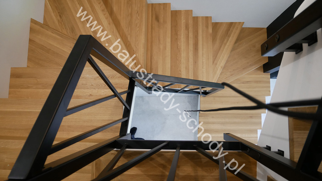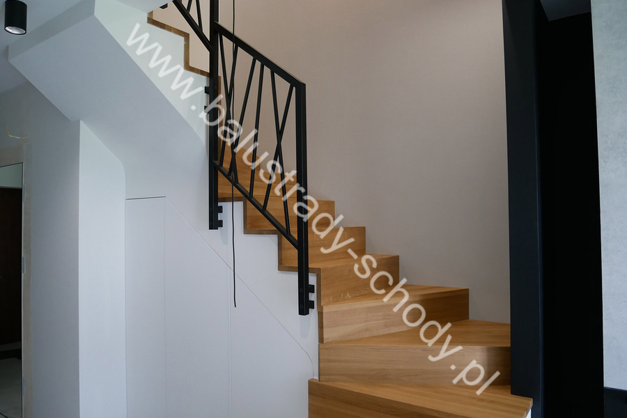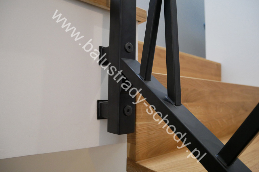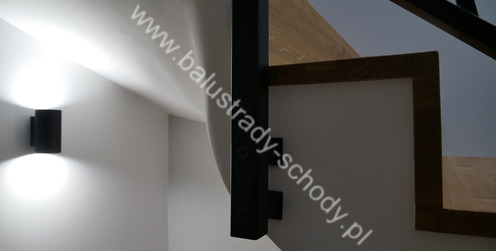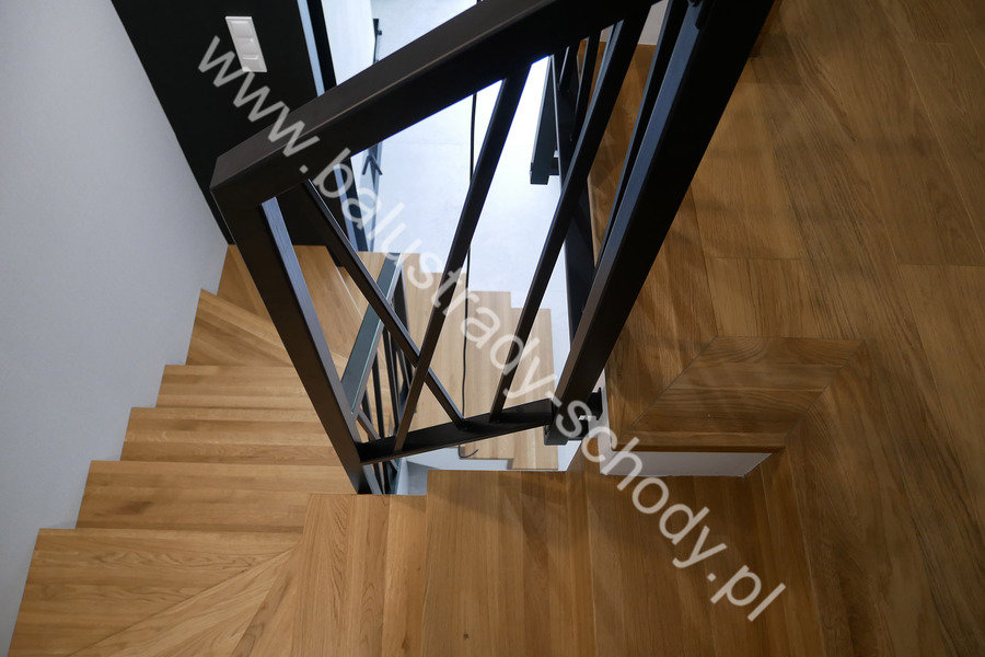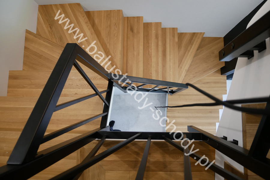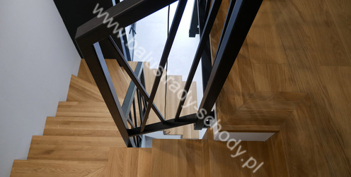 Balustrady wewnętrzne mocowane do policzka schodów wewnętrznych, nieregularnych w sposób kaskadowy. Wzór artystyczny w formie pionowych wypełnień wykonanych z profili ułożonych w 2 osiach. Takie rozłożenie tralek daje nam niesamowity efekt wizualny w formie 3d. Kolor balustrad to matowa czerń w klasycznym już RAL 9005. Śruby w czarnej oksydzie, słupki kwadratowe i wszystko inne dopięte na ostatni guzik.