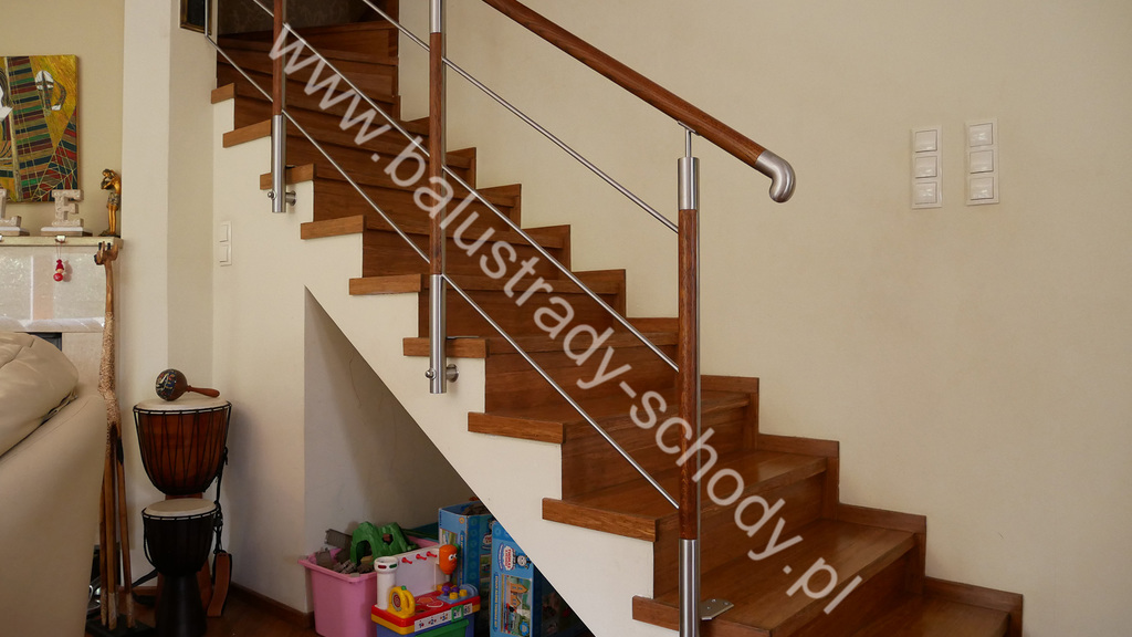 Balustrady wewnętrzne wykonane ze stali nierdzewnej szlifowanej w połączeniu z drewnem dębowym. Zastąpiły one balustrady wykonane już spory czas temu nie przez naszą firmę z samego drewna - bez elementów stalowych, które nie wytrzymały jednak próby czasu. Nasza technologia dzięki zastosowaniu konstrukcji nierdzewnej zapewnia balustradzie nieśmiertelność. Drewno ociepla i stanowi dodatkowy element konstrukcyjny. Zostało one dopasowane kolorystycznie poprzez bejcę nitro w kolorze BRĄZ 22-45.