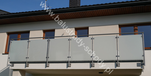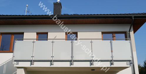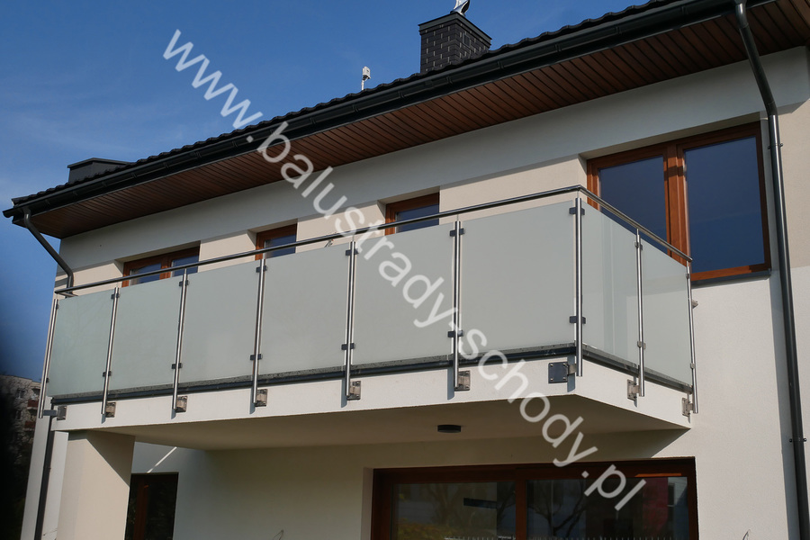 Balustrady nierdzewne zewnętrzne wykonane w strukturze szlifowanej. Tafle szkła z folią mleczną zamontowane poprzez systemowe uchwyty. Taka kombinacja zapewnia domownikom dyskrecję i łapie kontrast z wyraźną stalą szlachetną. Montaż słupków bez marek na ocieplony już taras poprzez zastosowanie tzw. lasz. Jest to alternatywa w sytuacji gdy na etapie ocieplania budynku nie przygotujemy mocowań pod słupki.