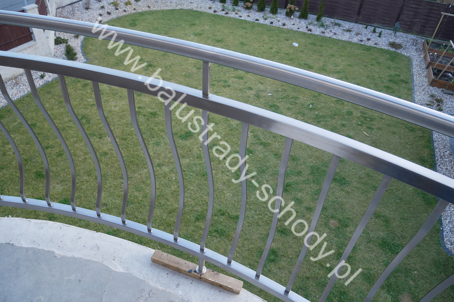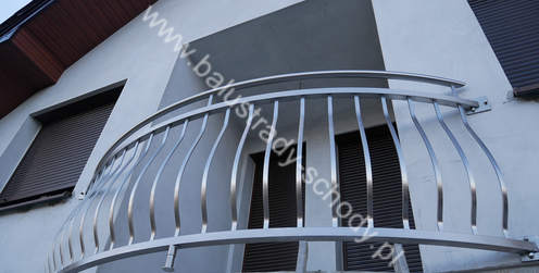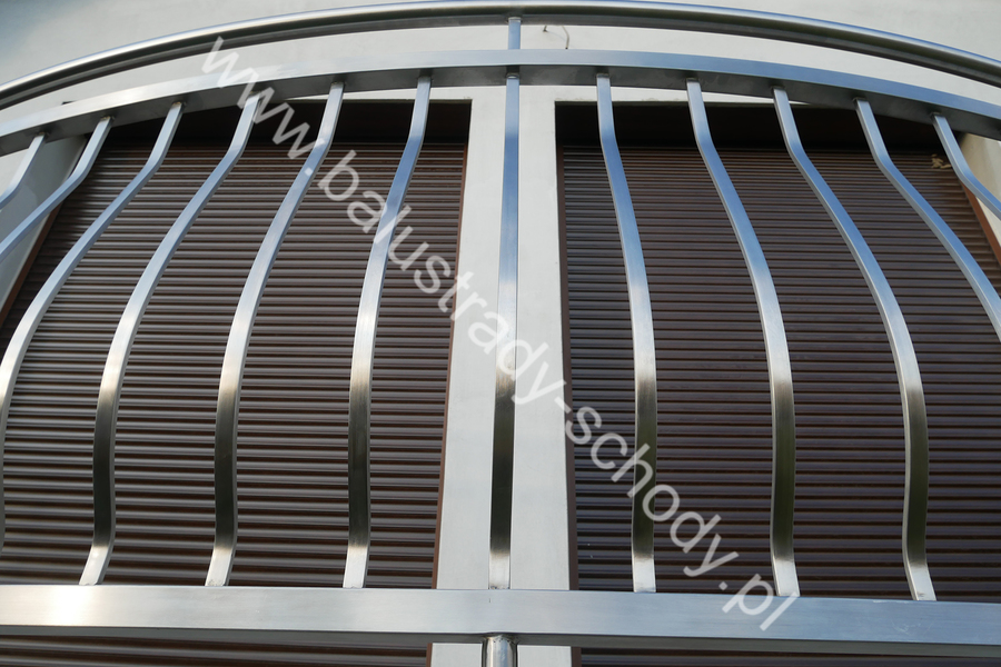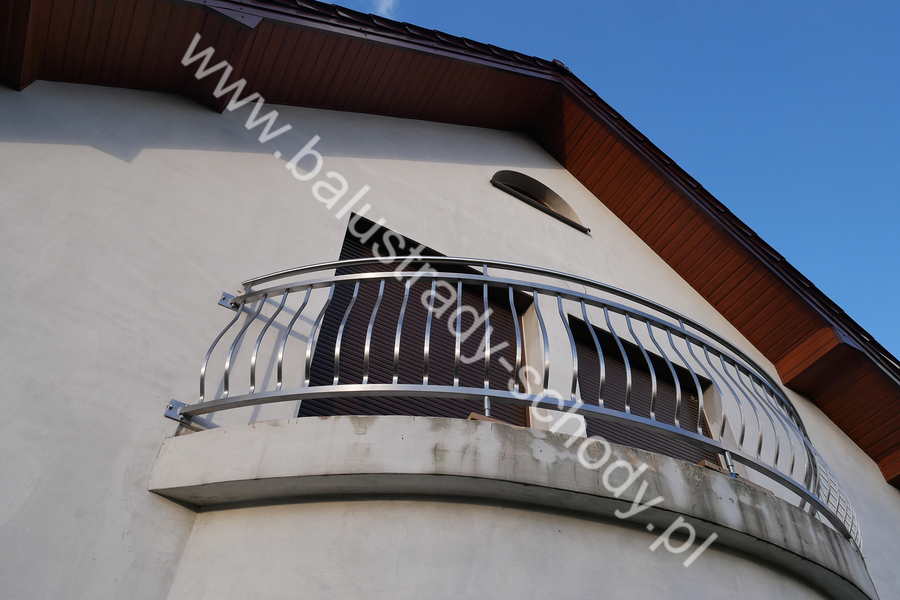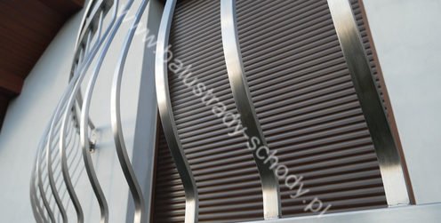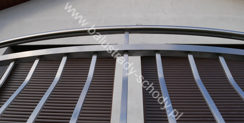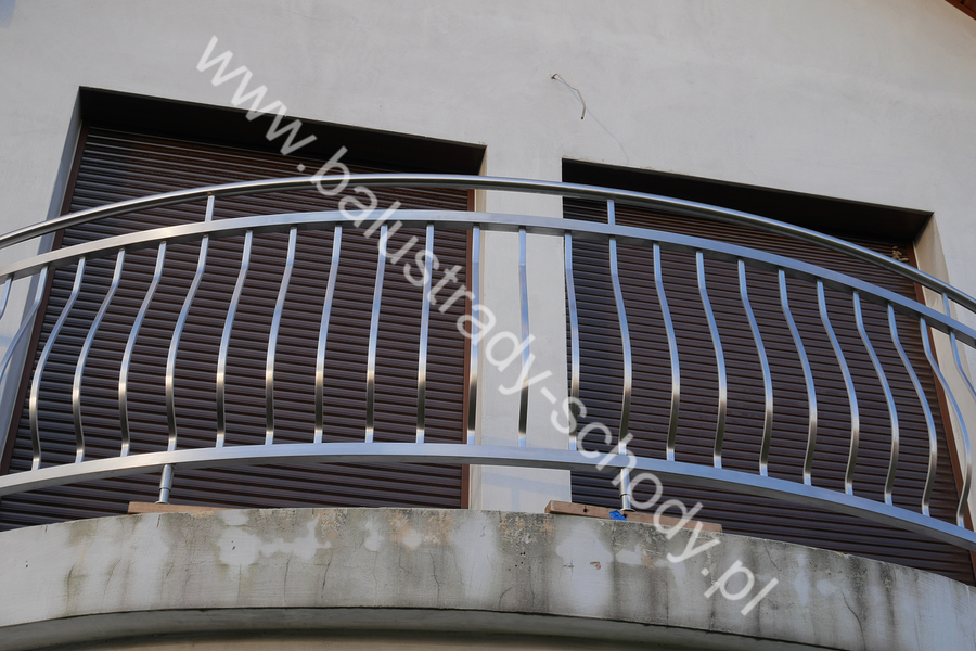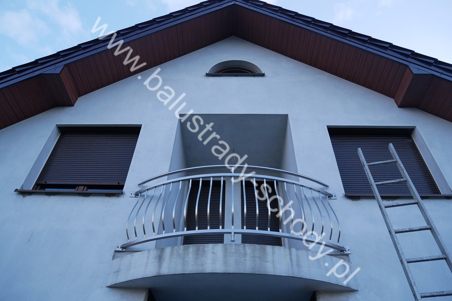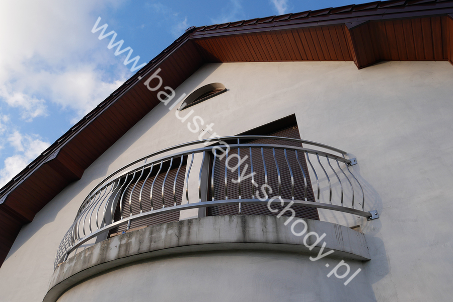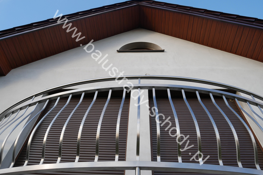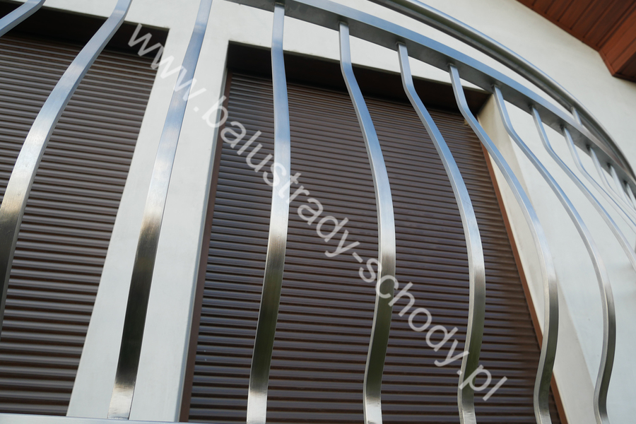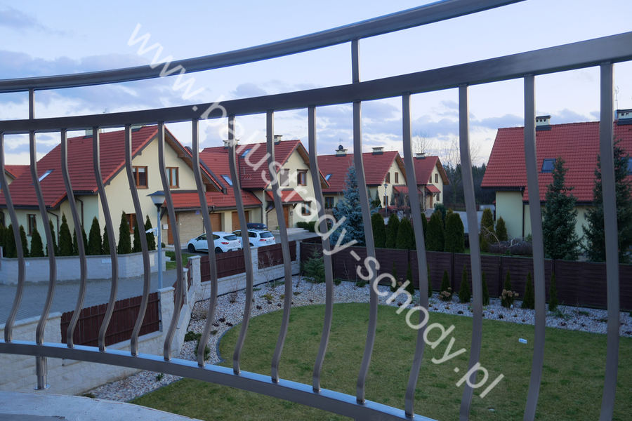 Balustrady zewnętrzne wykonane ze stali nierdzewnej w strukturze szlifowanej. Wypełnienie pionowe wykonane w oryginalny sposób w postaci tzw. brzuszków stworzonych z odpowiednio wymodelowanych przez nas płaskowników. Te rozwiązanie zapewnia ciekawy efekt wizualny szczególnie biorąc pod uwagę, że stal szlachetna doskonale odbija promienie słoneczne. W momencie spojrzenia na balustrady pojawia się więc nam obraz, który wygląda niespotykanie. Balustrada ta jest bez wątpienia ciekawym rozwiązaniem architektonicznym.