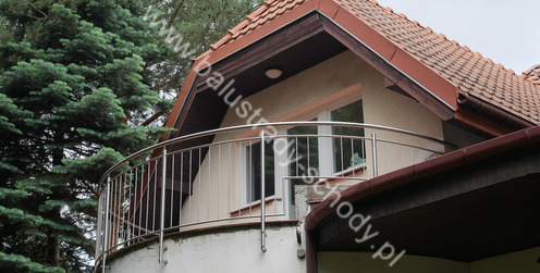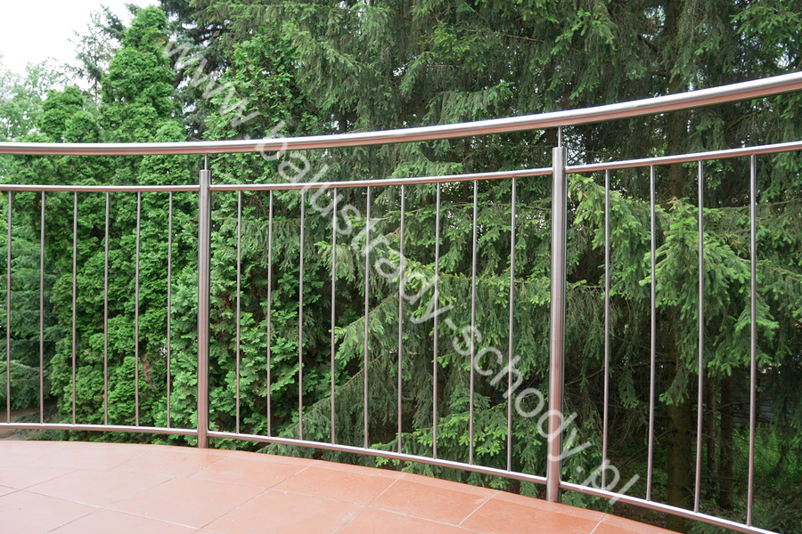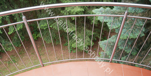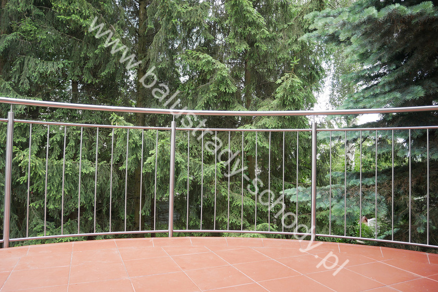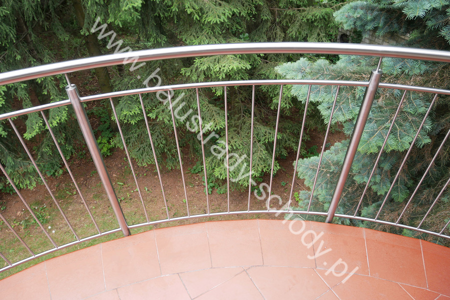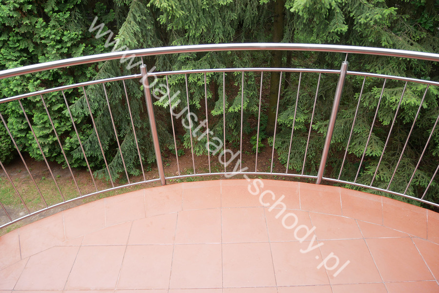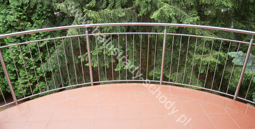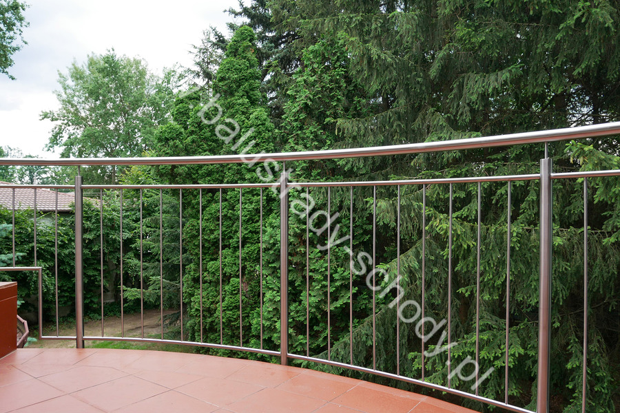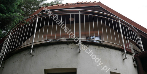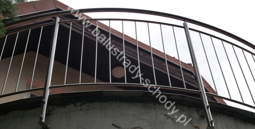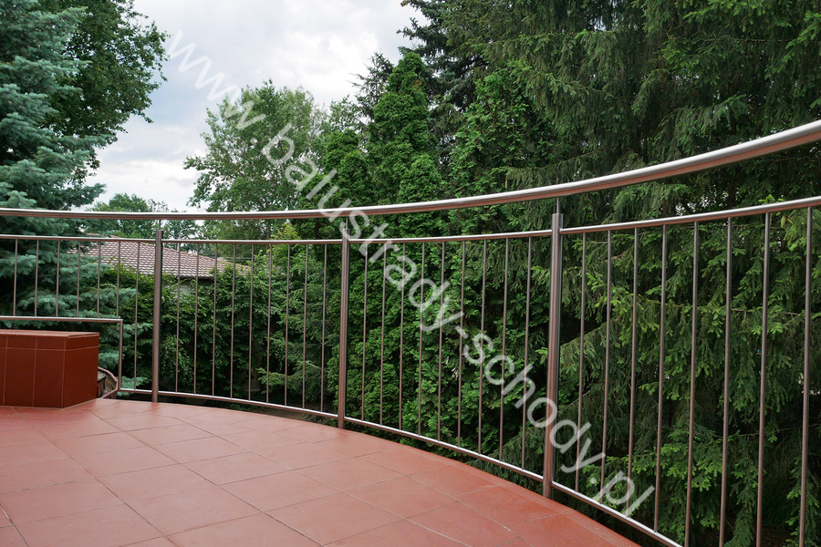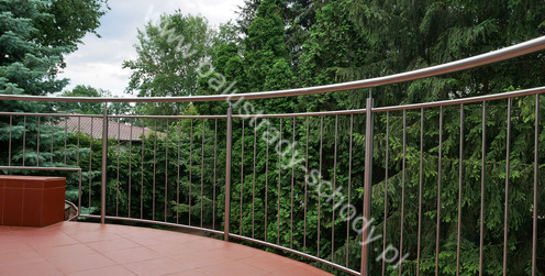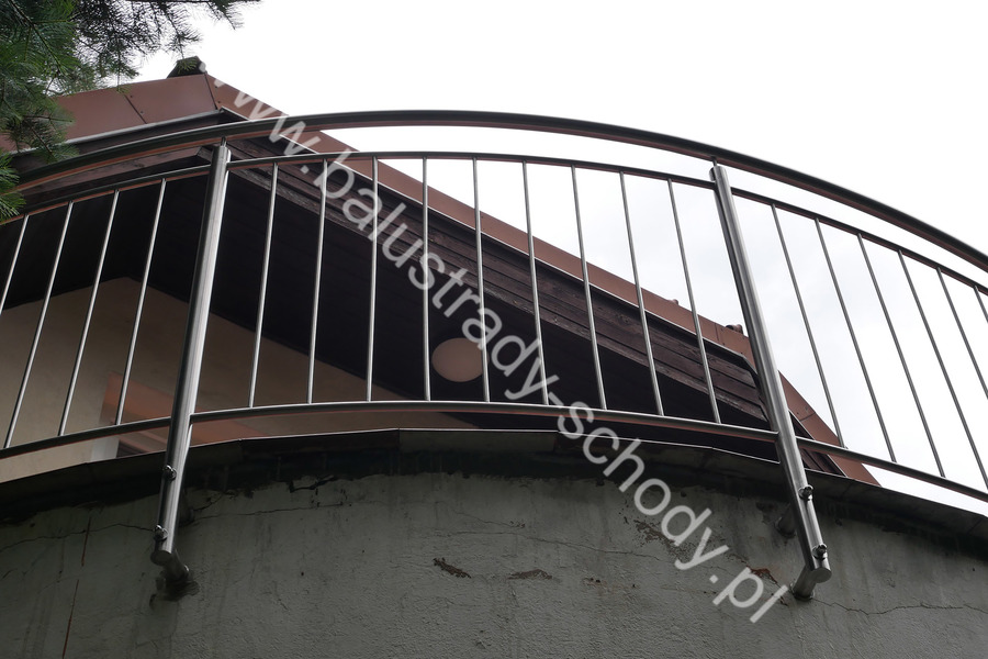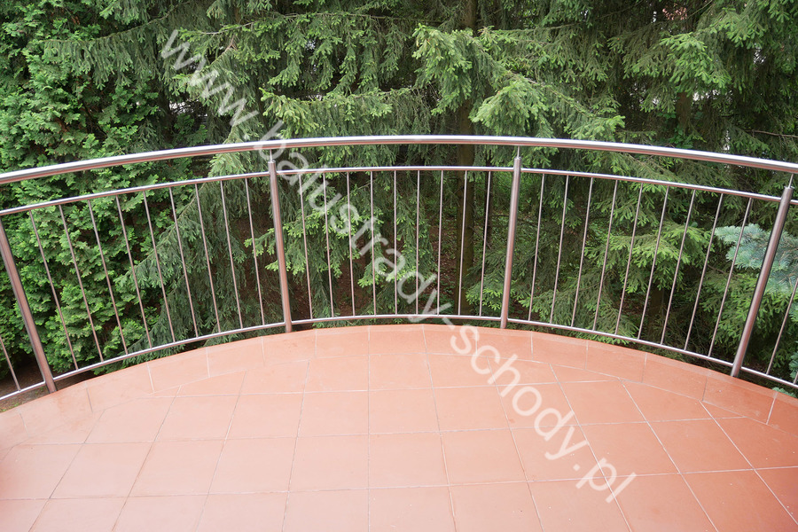 Balustrady zewnętrzne wykonane ze stali nierdzewnej w strukturze szlifowanej. Wypełnienie w postaci delikatnych pionowych prętów zapewniających maksimum bezpieczeństwa. Montaż na zewnątrz tarasu poprzez dwupunktowe odbicia. Łuk balustrady dostosowany indywidualnie do łuku tarasu. Realizacja ta wymagała sporej precyzji zarówno przy pomiarach jak i samej produkcji. Jak widać na fotkach wszystko przebiegło pomyślnie.