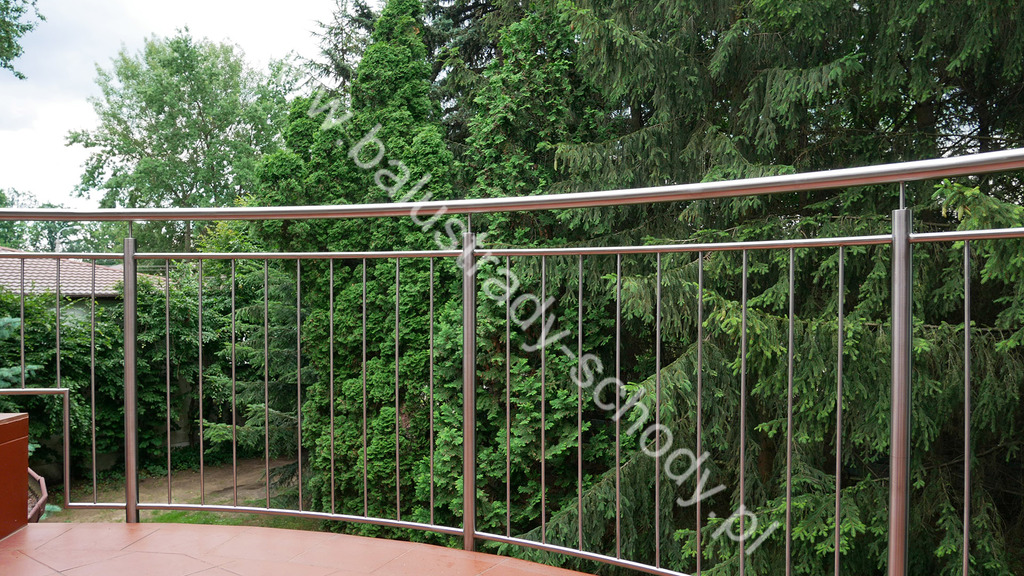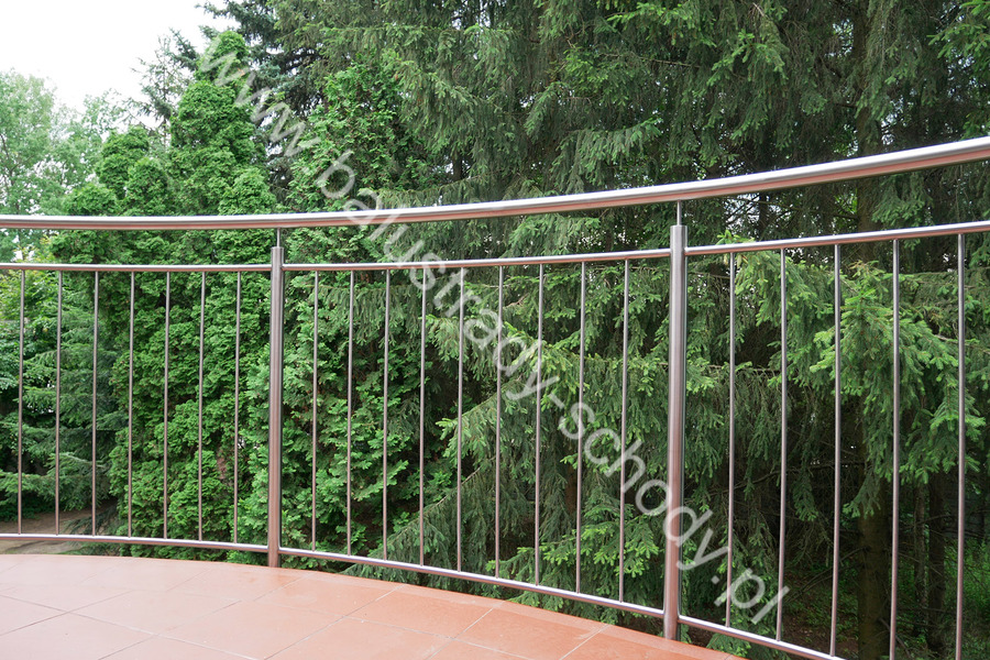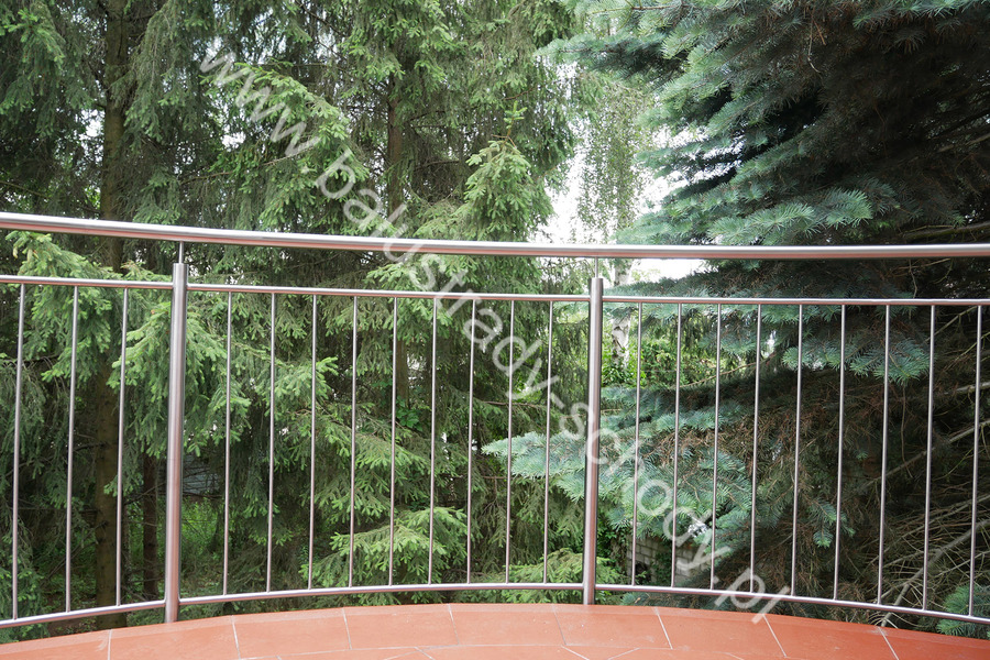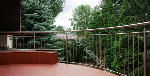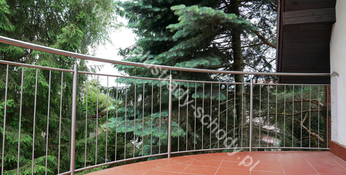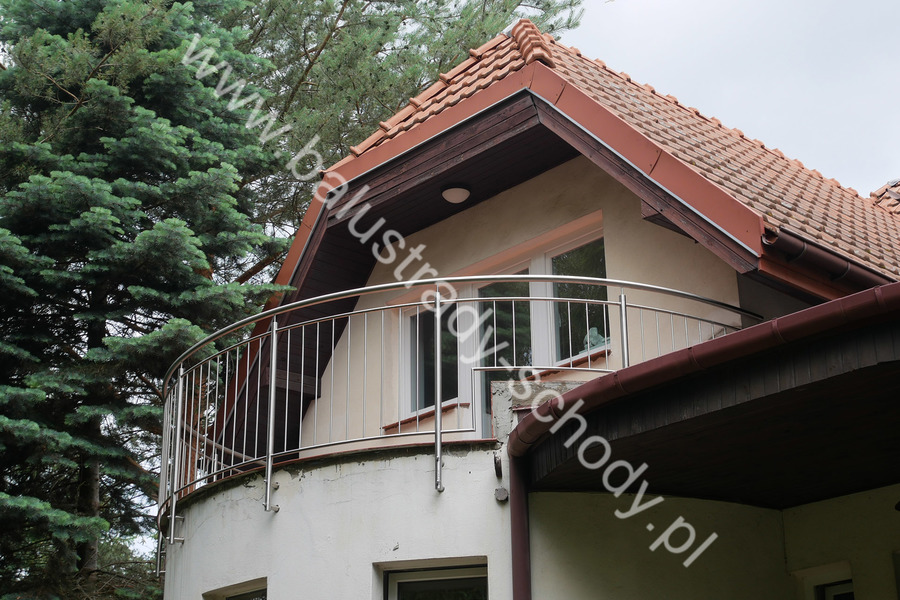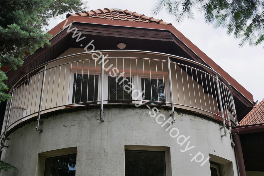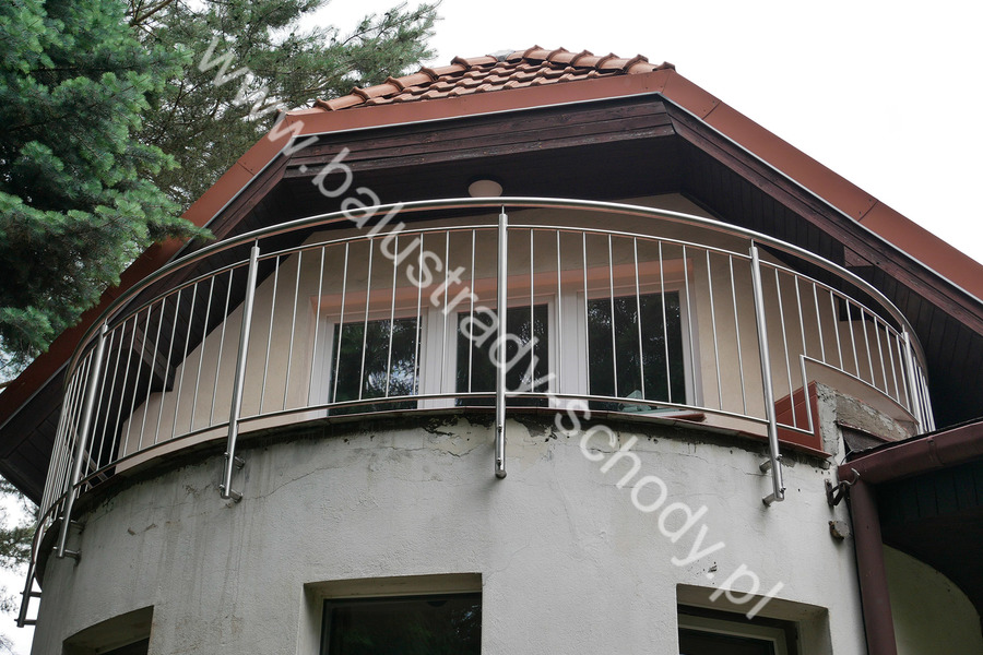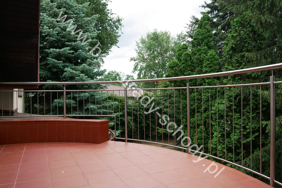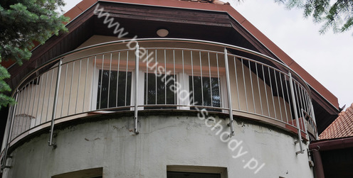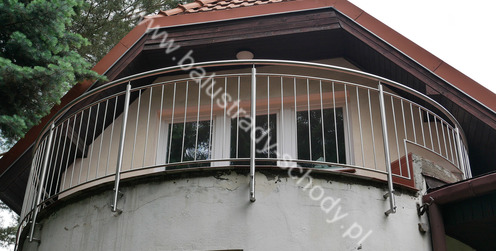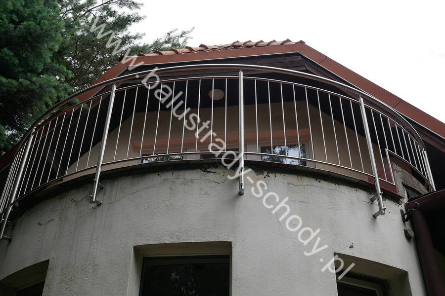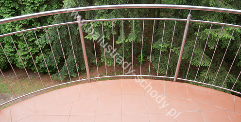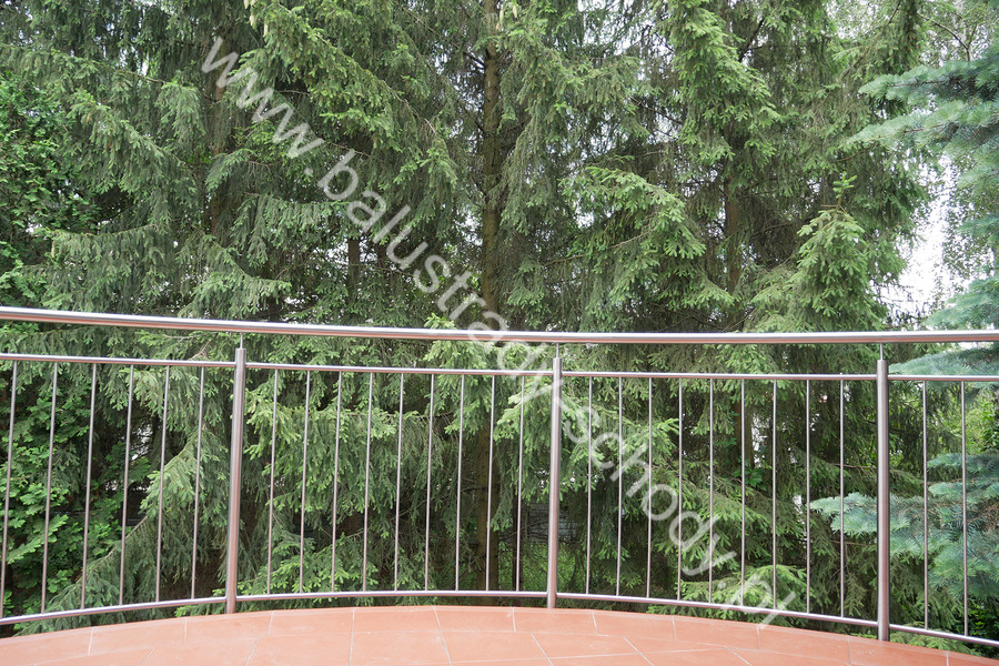 Balustrady zewnętrzne wykonane ze stali nierdzewnej w strukturze szlifowanej. Wypełnienie w postaci delikatnych pionowych prętów zapewniających maksimum bezpieczeństwa. Montaż na zewnątrz tarasu poprzez dwupunktowe odbicia. Łuk balustrady dostosowany indywidualnie do łuku tarasu. Realizacja ta wymagała sporej precyzji zarówno przy pomiarach jak i samej produkcji. Jak widać na fotkach wszystko przebiegło pomyślnie.