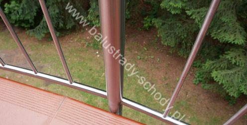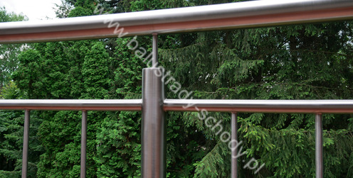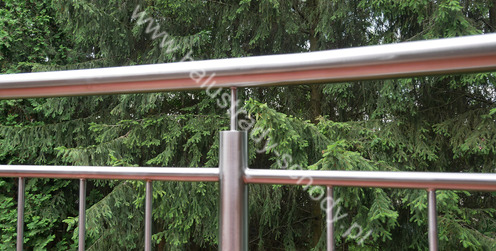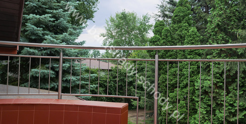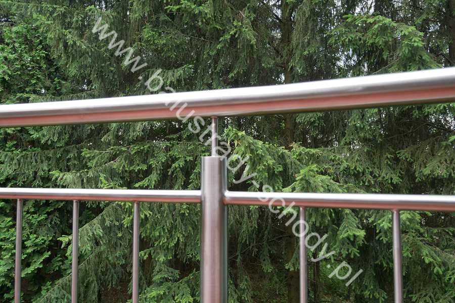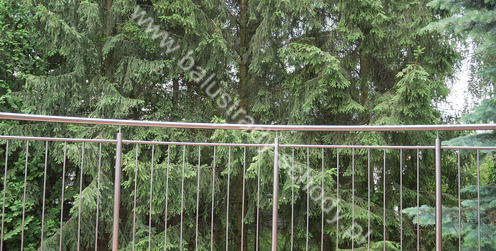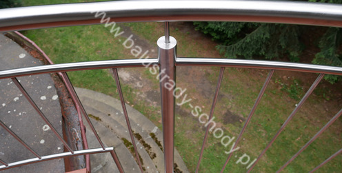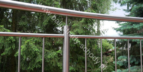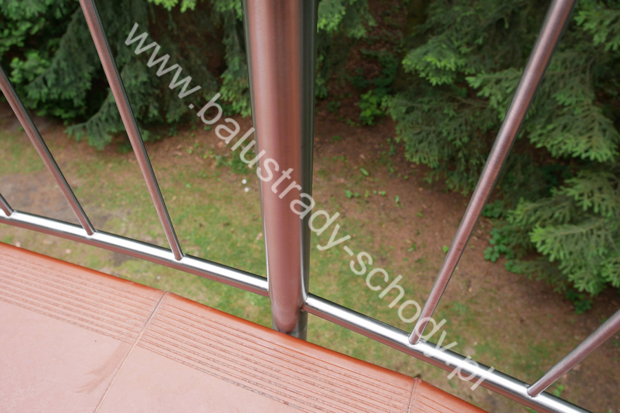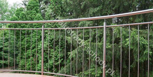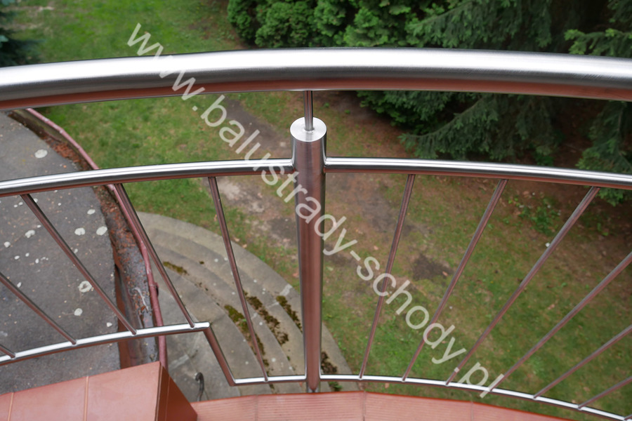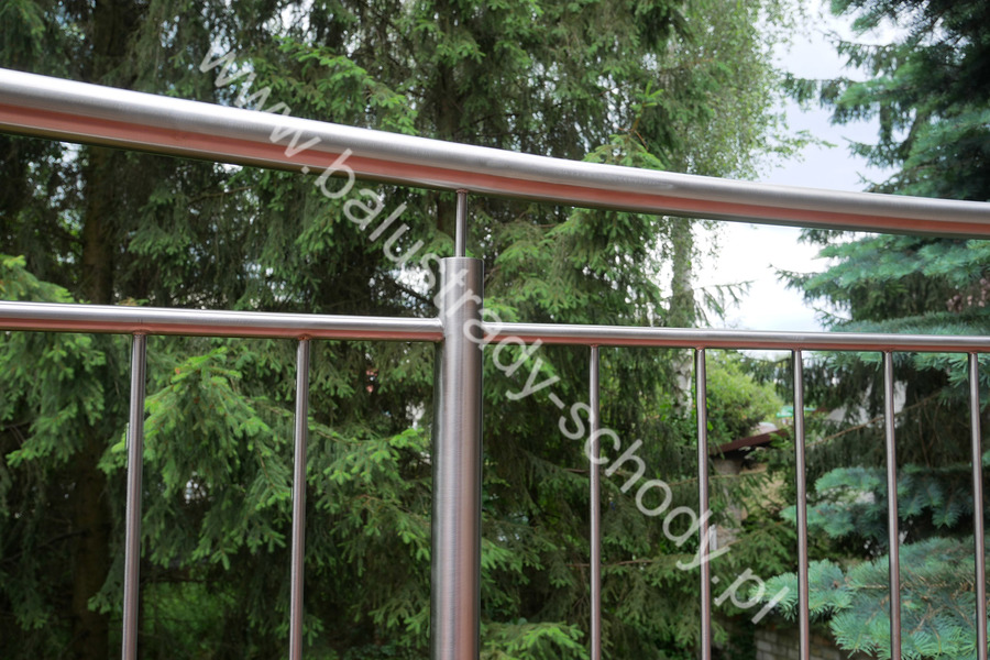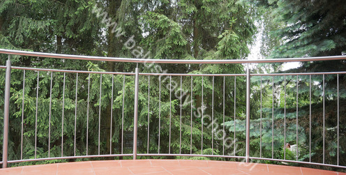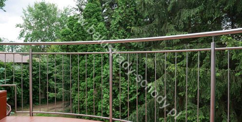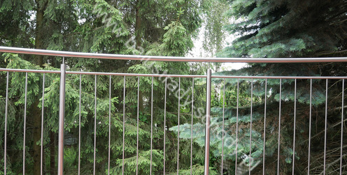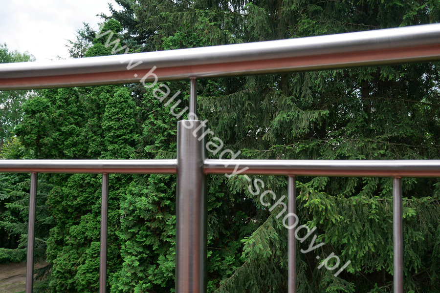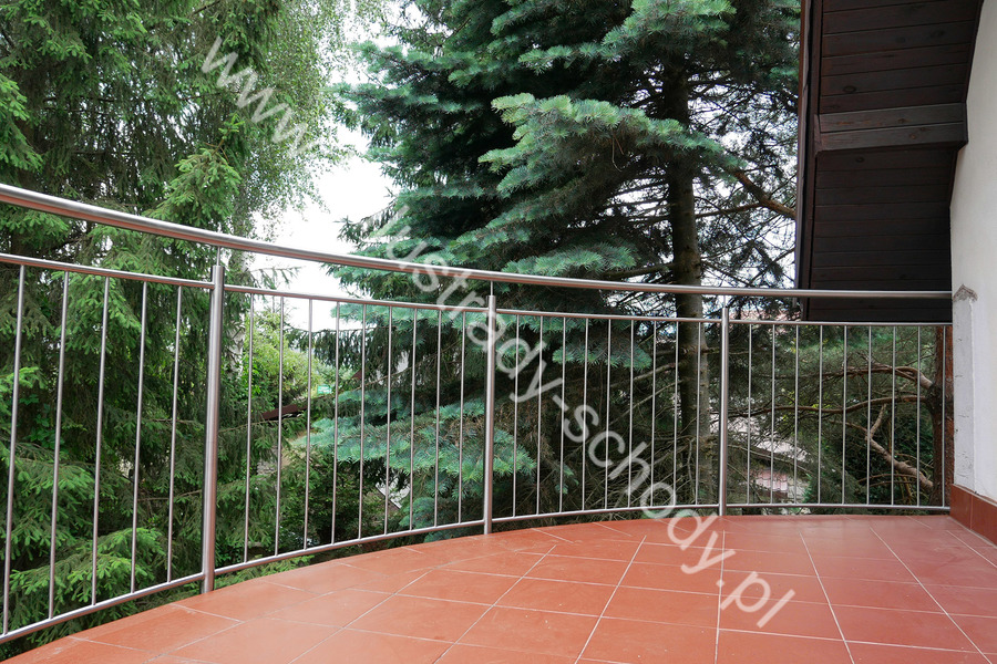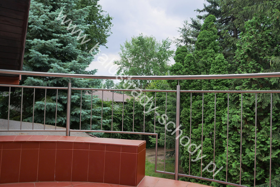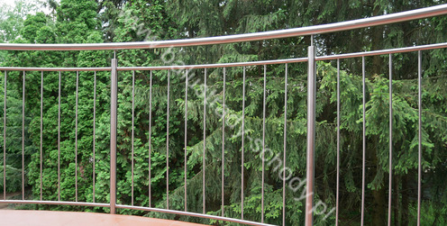 Balustrady zewnętrzne wykonane ze stali nierdzewnej w strukturze szlifowanej. Wypełnienie w postaci delikatnych pionowych prętów zapewniających maksimum bezpieczeństwa. Montaż na zewnątrz tarasu poprzez dwupunktowe odbicia. Łuk balustrady dostosowany indywidualnie do łuku tarasu. Realizacja ta wymagała sporej precyzji zarówno przy pomiarach jak i samej produkcji. Jak widać na fotkach wszystko przebiegło pomyślnie.