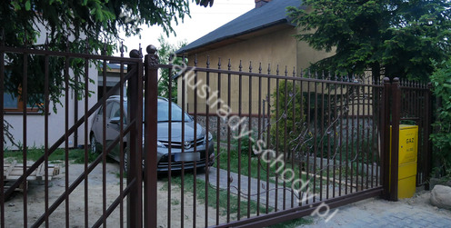Ogrodzenie w nowoczesnej formie z zastosowaniem elementów kutych, grotów oraz stalowych liści. Nawiązuje do balustrady na tarasie, którą wykonywaliśmy na budynku w 1 etapie swoich prac. Wszystkie nasze prace na tym obiekcie zostały ocynkowane ogniowo i polakierowane na ciemny brąz RAL 8017 mat. Brama przesuwna została zaprojektowana co do centymetra wykorzystując daną przestrzeń tak aby wszystko było funkcjonalne.