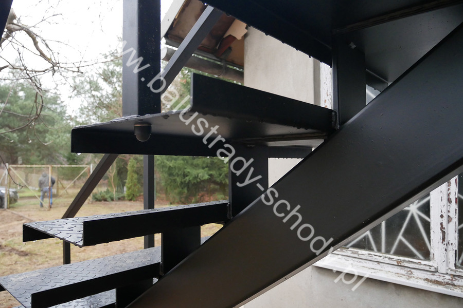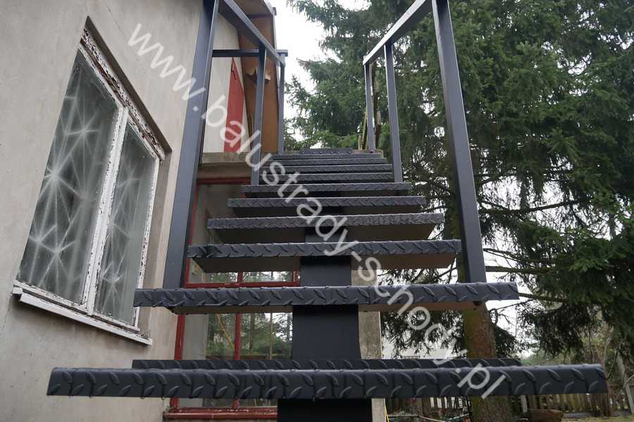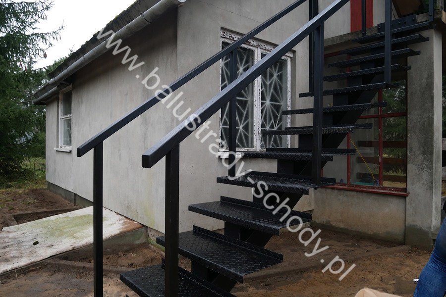 Schody zewnętrzne wykonane od A do Z przez naszą firmę. Od projektu, poprzez fundament, prace na warsztacie i na montażu. Ciekawa konstrukcja na masywnej belce środkowej ze stopniami wykonanymi z zaginanej blachy ryflowanej. Całość okraszona delikatną baustradą po obu stronach aby zapewnić bezpieczeństwo użytkowania. Kolor nie oryginalny bo bardzo popularny teraz czarny mat RAL 9005. Myślę, że takie konstrukcje w tej chwili mają swój czas i odnajdą się bez wątpienia nie tylko na działce ale i w domach. Zapraszamy więc do współpracy.