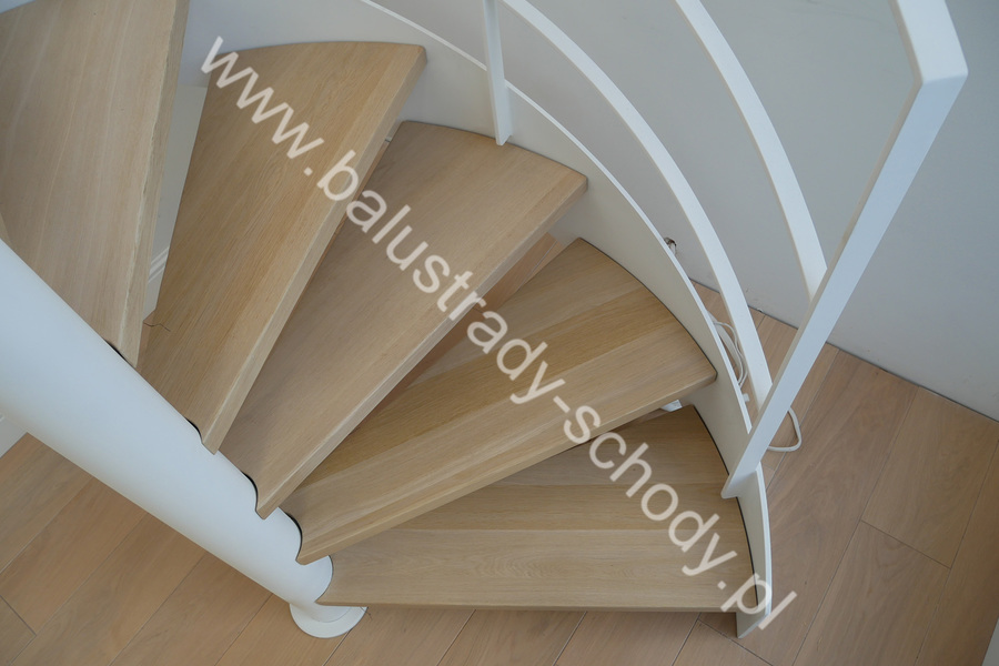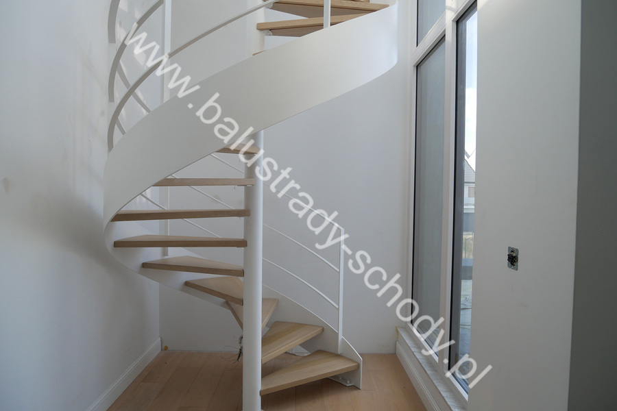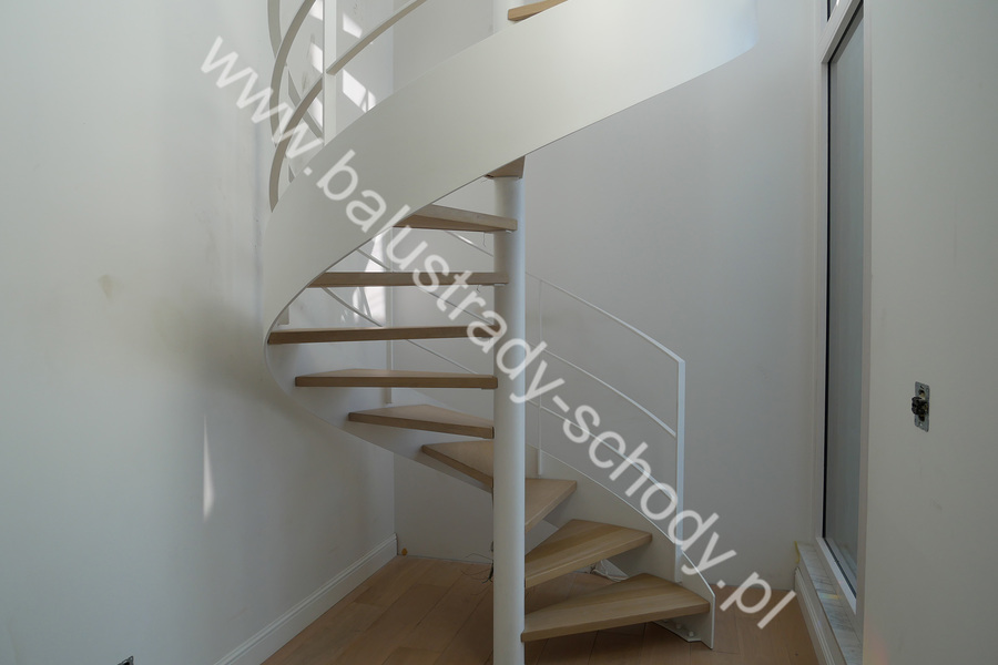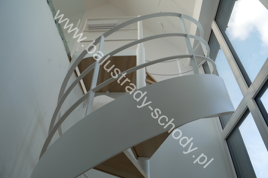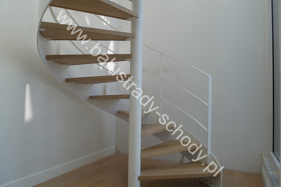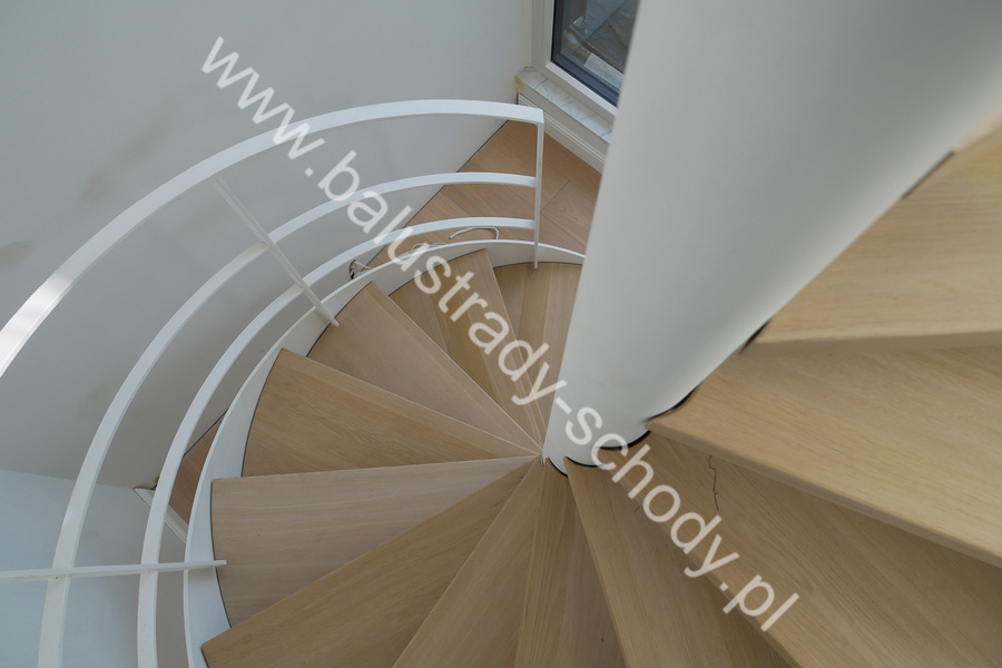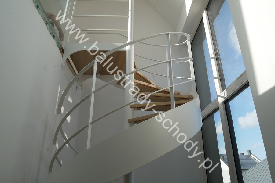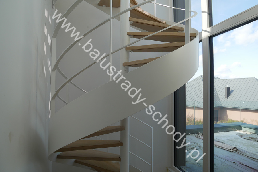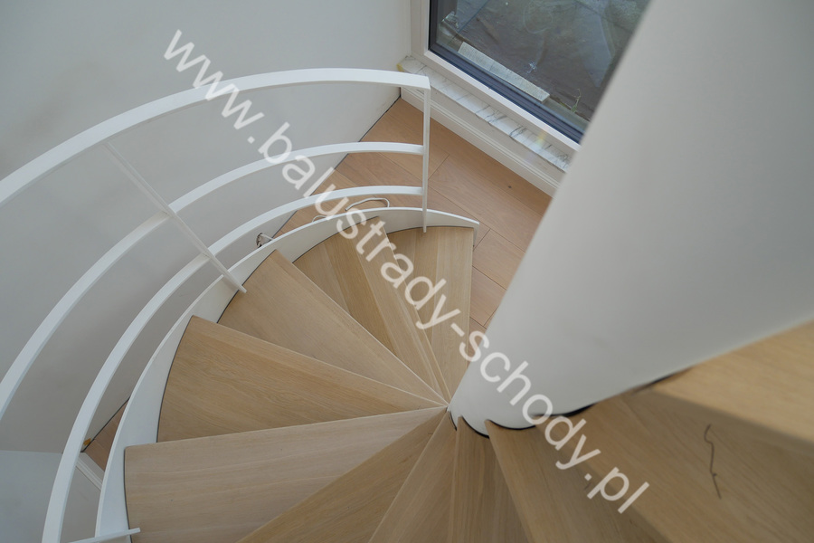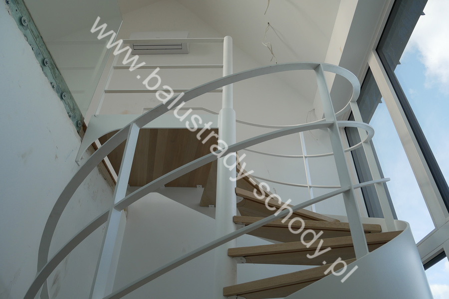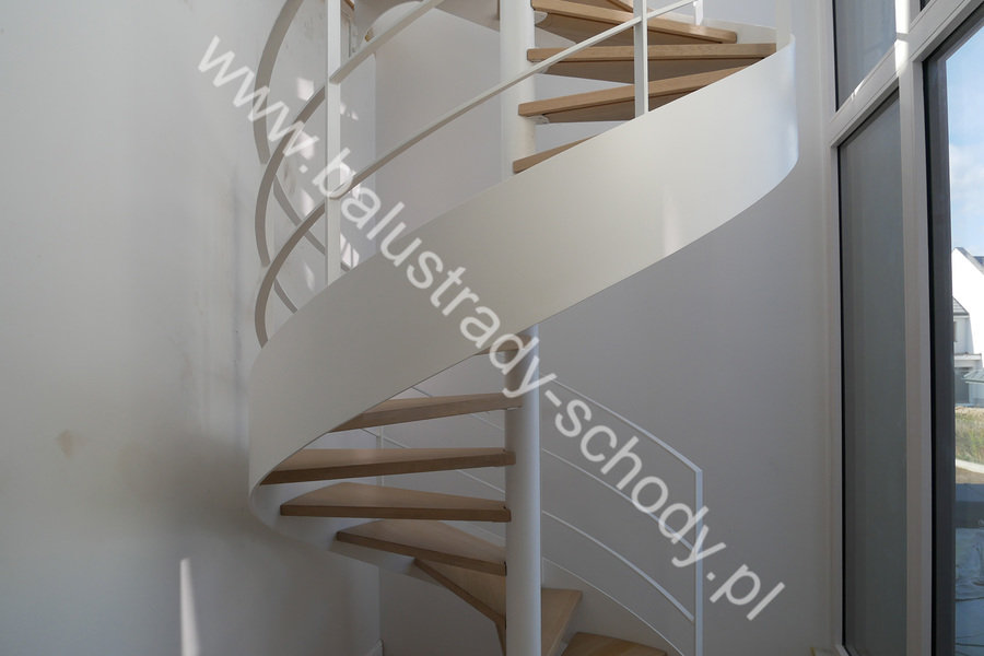 Schody spiralne wstęgowe wykonane z walcowanej ręcznie blachy o odpowiednio dobranej grubości. W takich konstrukcjach bardzo ważne jest aby odpowiednio dobrać przekrój wstęgi oraz jej grubość, która zapewni schodom statykę. Doświadczenie jest więc niezbędnym czynnikiem do stworzenia takiej dzieła. Stopnie w widocznej realizacji wykonane zostały z bielonego dębu dopasowanego pod kolor podłogi klienta. Kolor stali to klasyczna już ciepła biel 9016 mat z palety RAL. W stopniach widać kanałki na docelowe oświetlenie led.