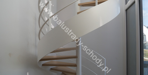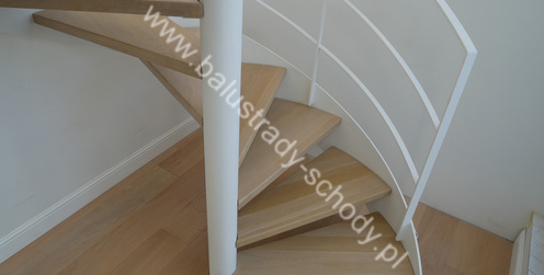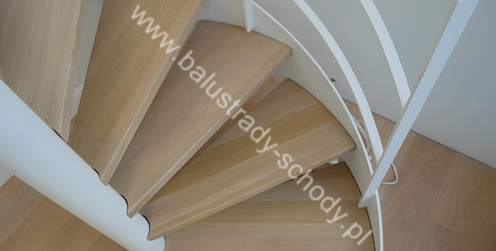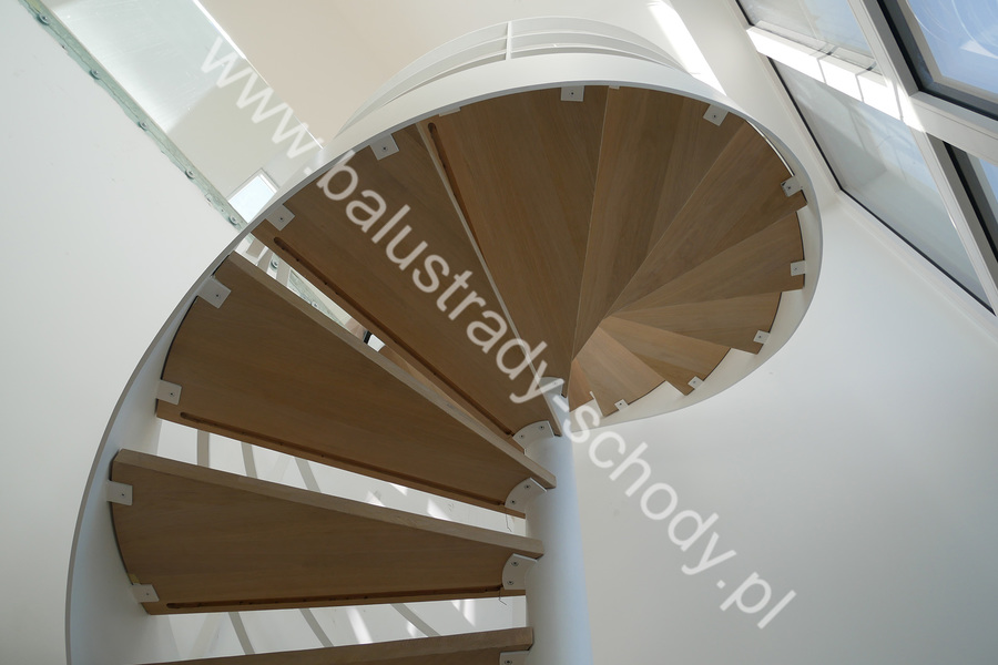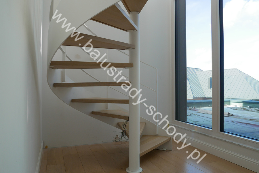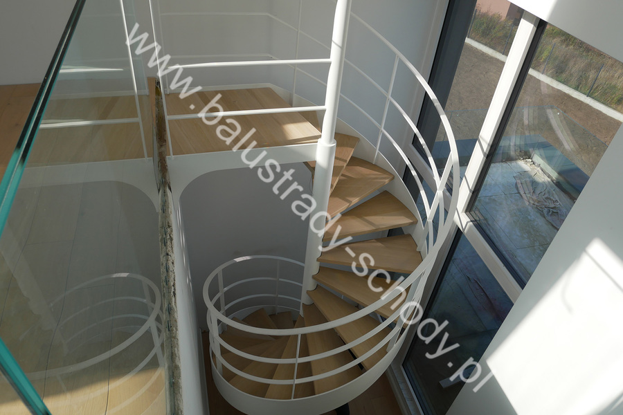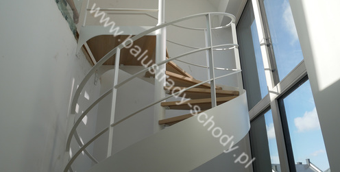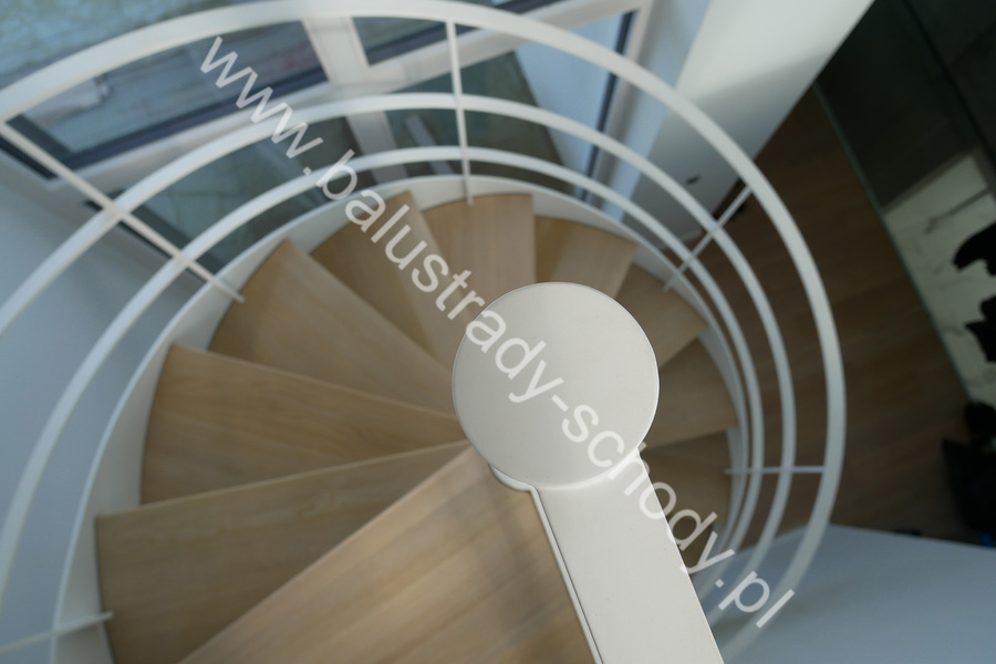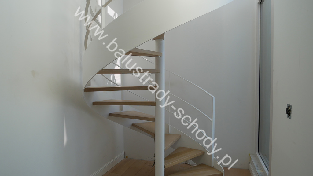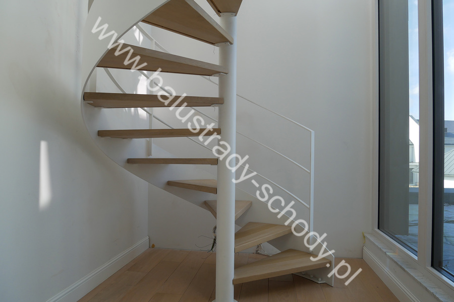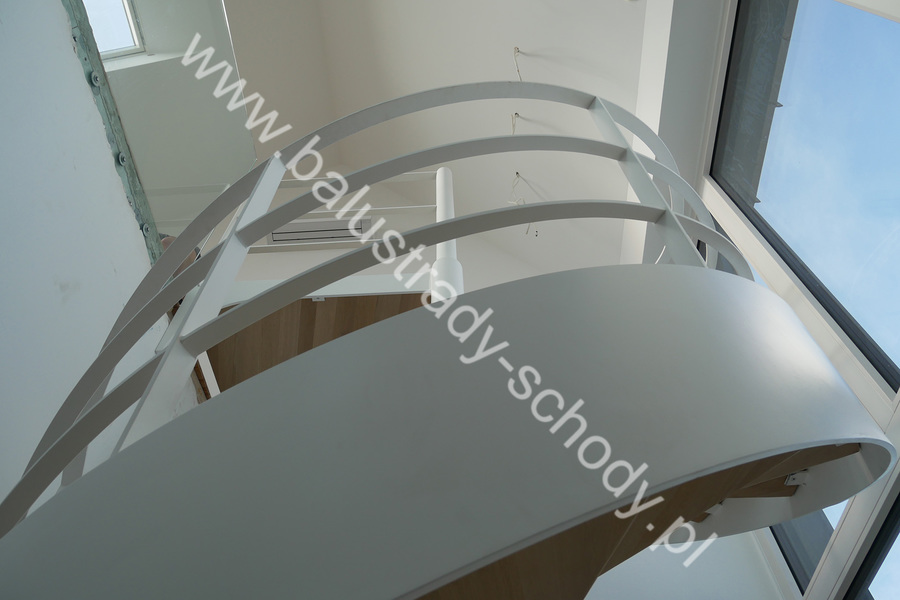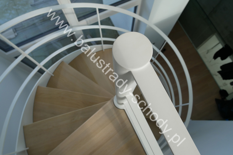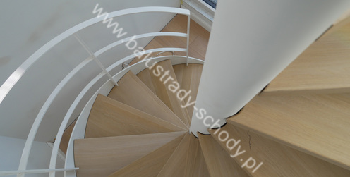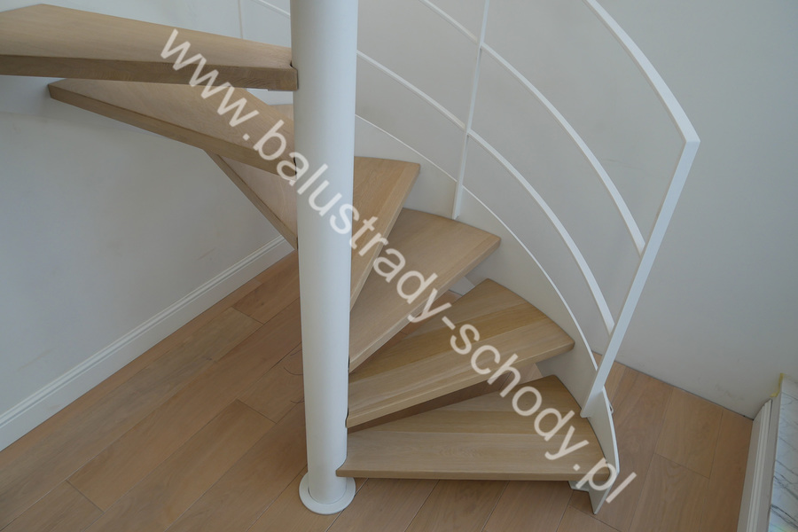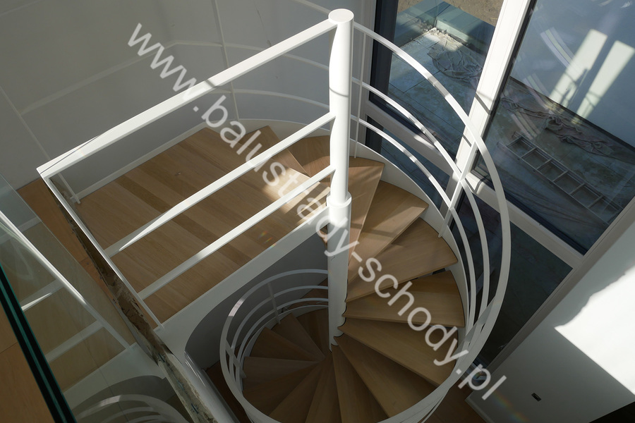 Schody spiralne wstęgowe wykonane z walcowanej ręcznie blachy o odpowiednio dobranej grubości. W takich konstrukcjach bardzo ważne jest aby odpowiednio dobrać przekrój wstęgi oraz jej grubość, która zapewni schodom statykę. Doświadczenie jest więc niezbędnym czynnikiem do stworzenia takiej dzieła. Stopnie w widocznej realizacji wykonane zostały z bielonego dębu dopasowanego pod kolor podłogi klienta. Kolor stali to klasyczna już ciepła biel 9016 mat z palety RAL. W stopniach widać kanałki na docelowe oświetlenie led.