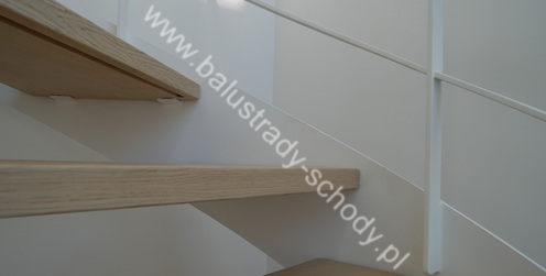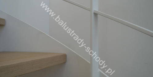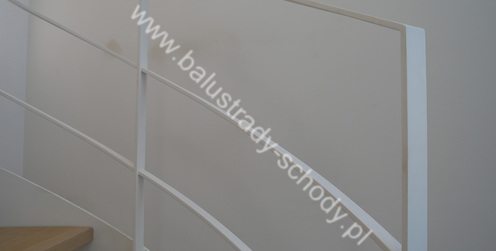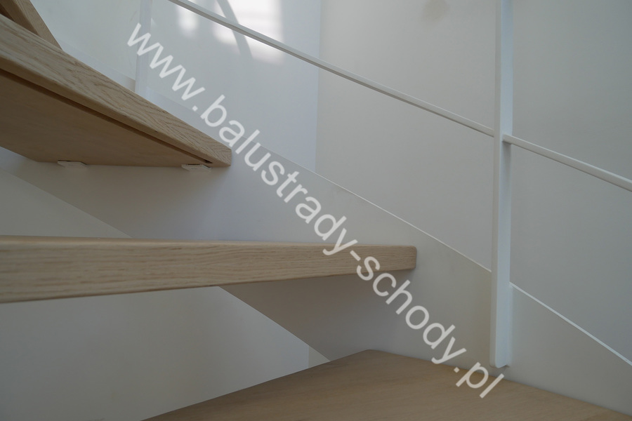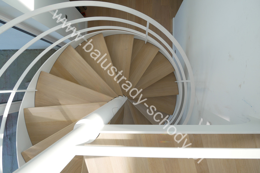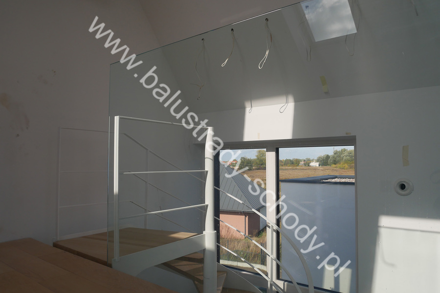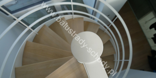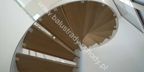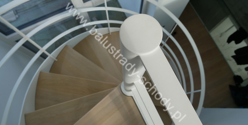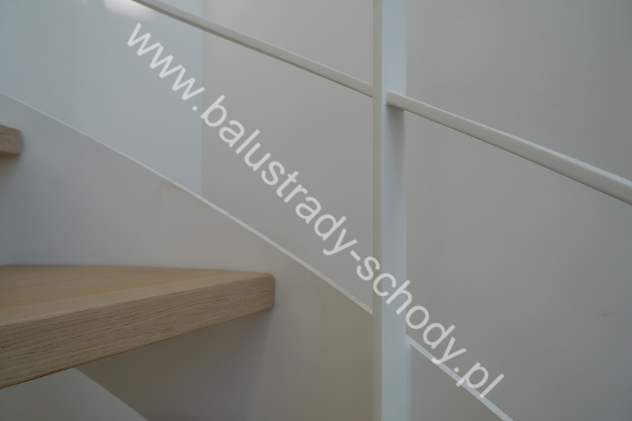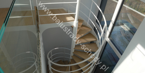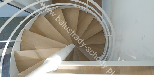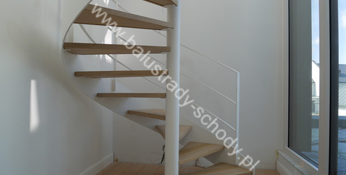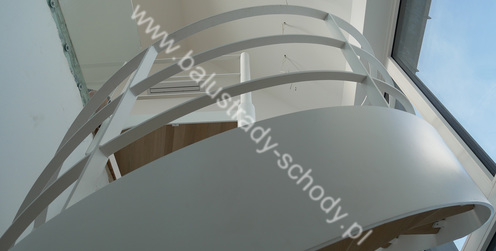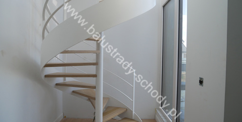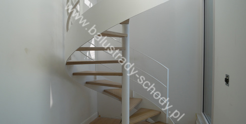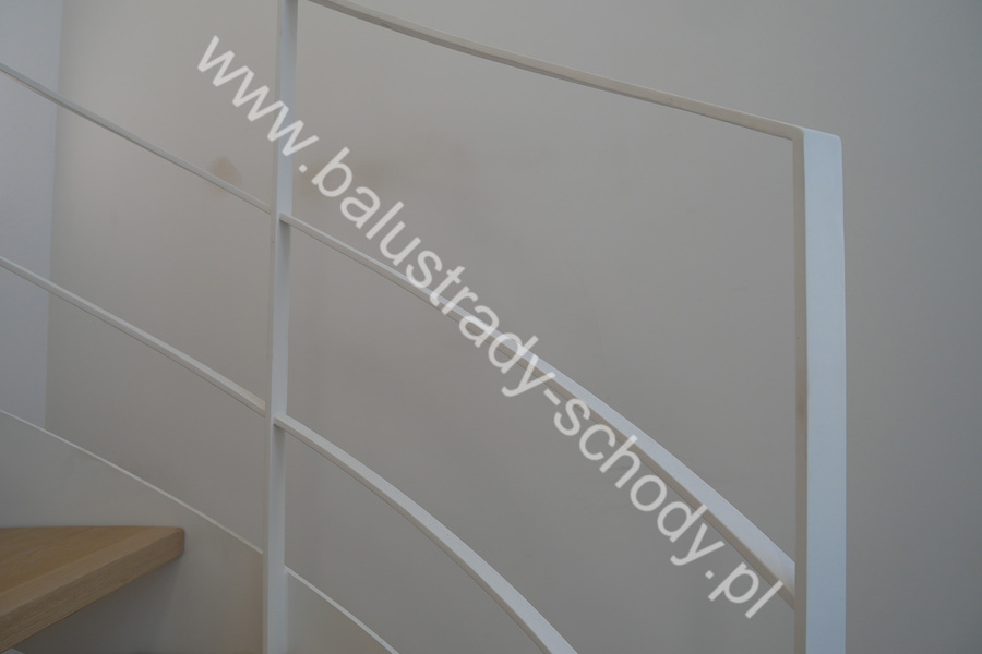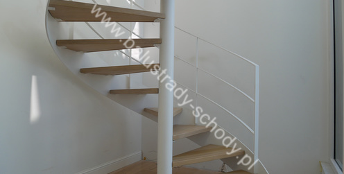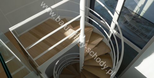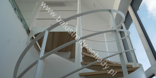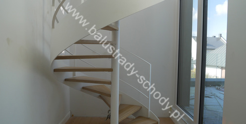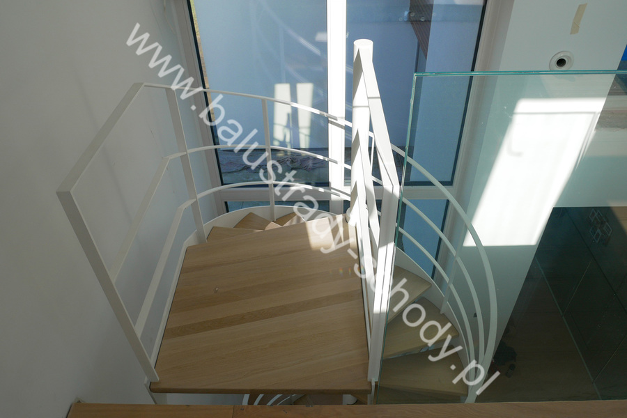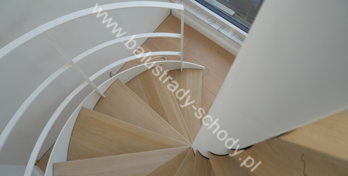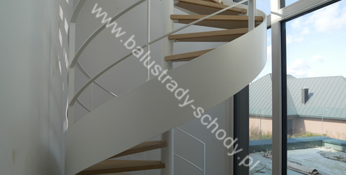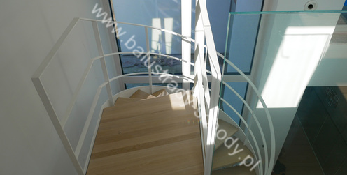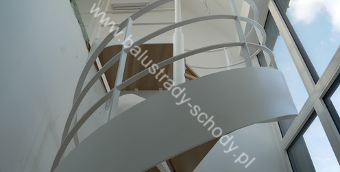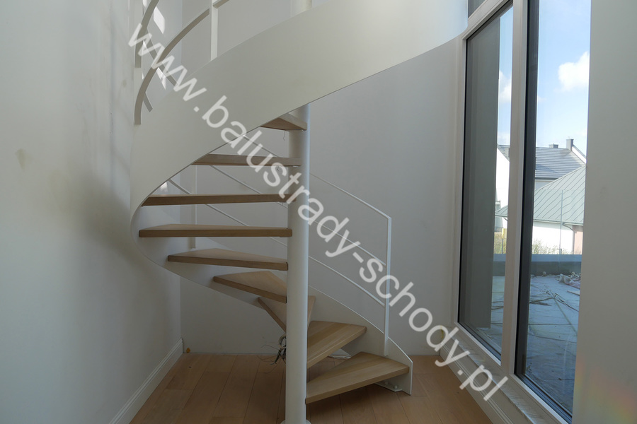Schody spiralne wstęgowe wykonane z walcowanej ręcznie blachy o odpowiednio dobranej grubości. W takich konstrukcjach bardzo ważne jest aby odpowiednio dobrać przekrój wstęgi oraz jej grubość, która zapewni schodom statykę. Doświadczenie jest więc niezbędnym czynnikiem do stworzenia takiej dzieła. Stopnie w widocznej realizacji wykonane zostały z bielonego dębu dopasowanego pod kolor podłogi klienta. Kolor stali to klasyczna już ciepła biel 9016 mat z palety RAL. W stopniach widać kanałki na docelowe oświetlenie led.